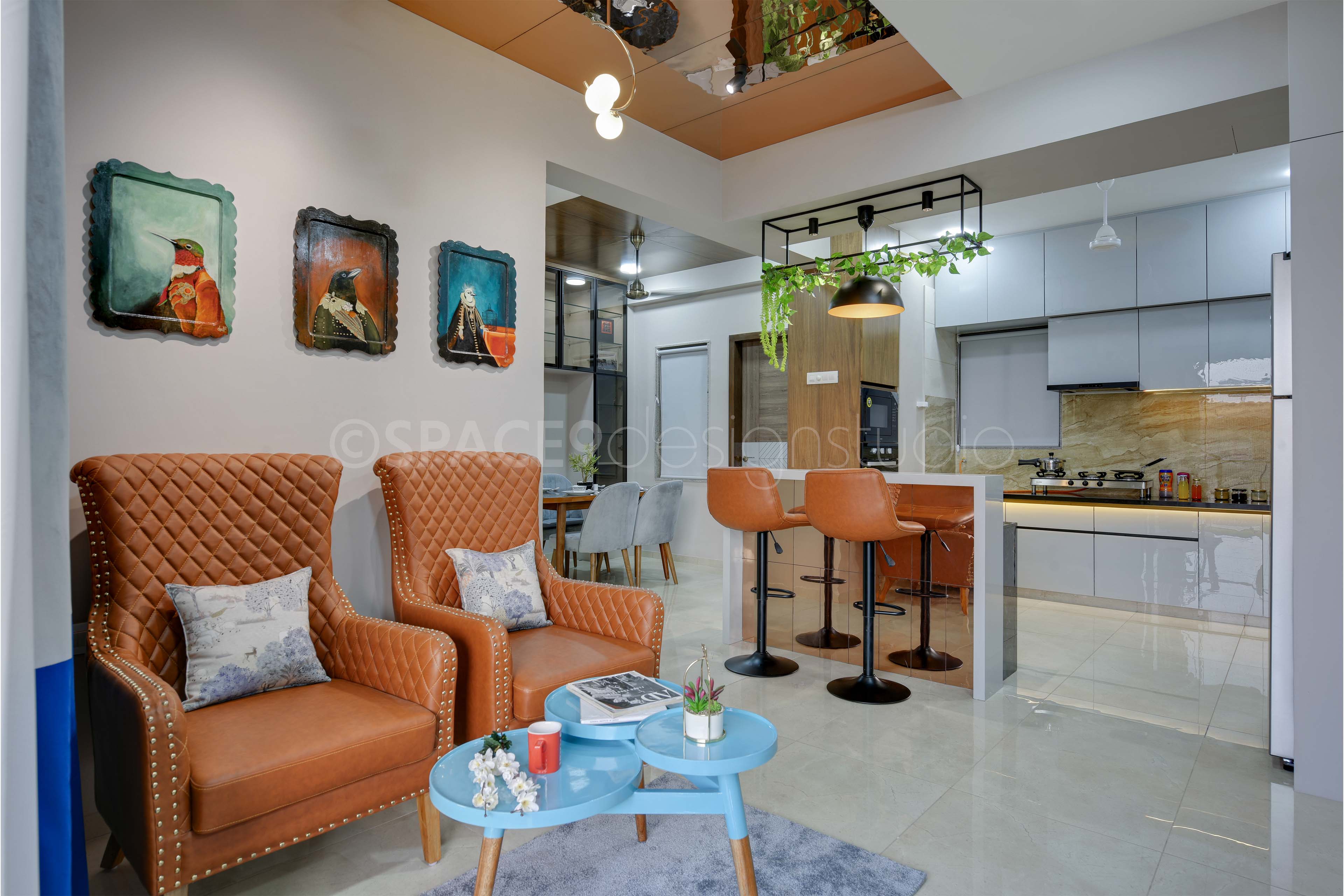 The bedrooms are individually styled to suit varied moods and needs—from playful, colourful designs with bold patterns and smart storage for children, to a serene master suite with textured headboards, luxurious fabrics, and seamless wardrobes. The living room exudes charm with neutral palettes highlighted by pops of color through accent chairs, cushions, and wall décor, making it both welcoming and stylish. An open-plan kitchen and dining zone further elevate the experience, featuring glossy cabinetry, streamlined countertops, and a chic breakfast counter that adds urban flair.