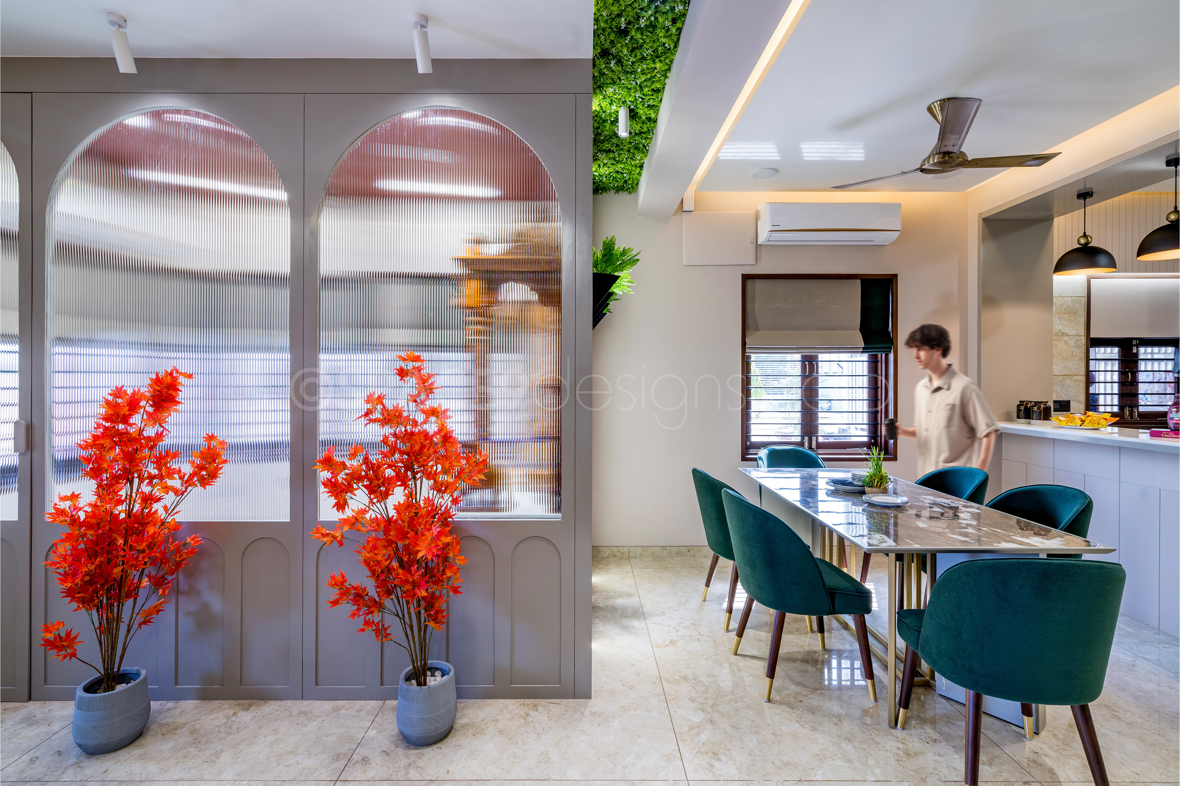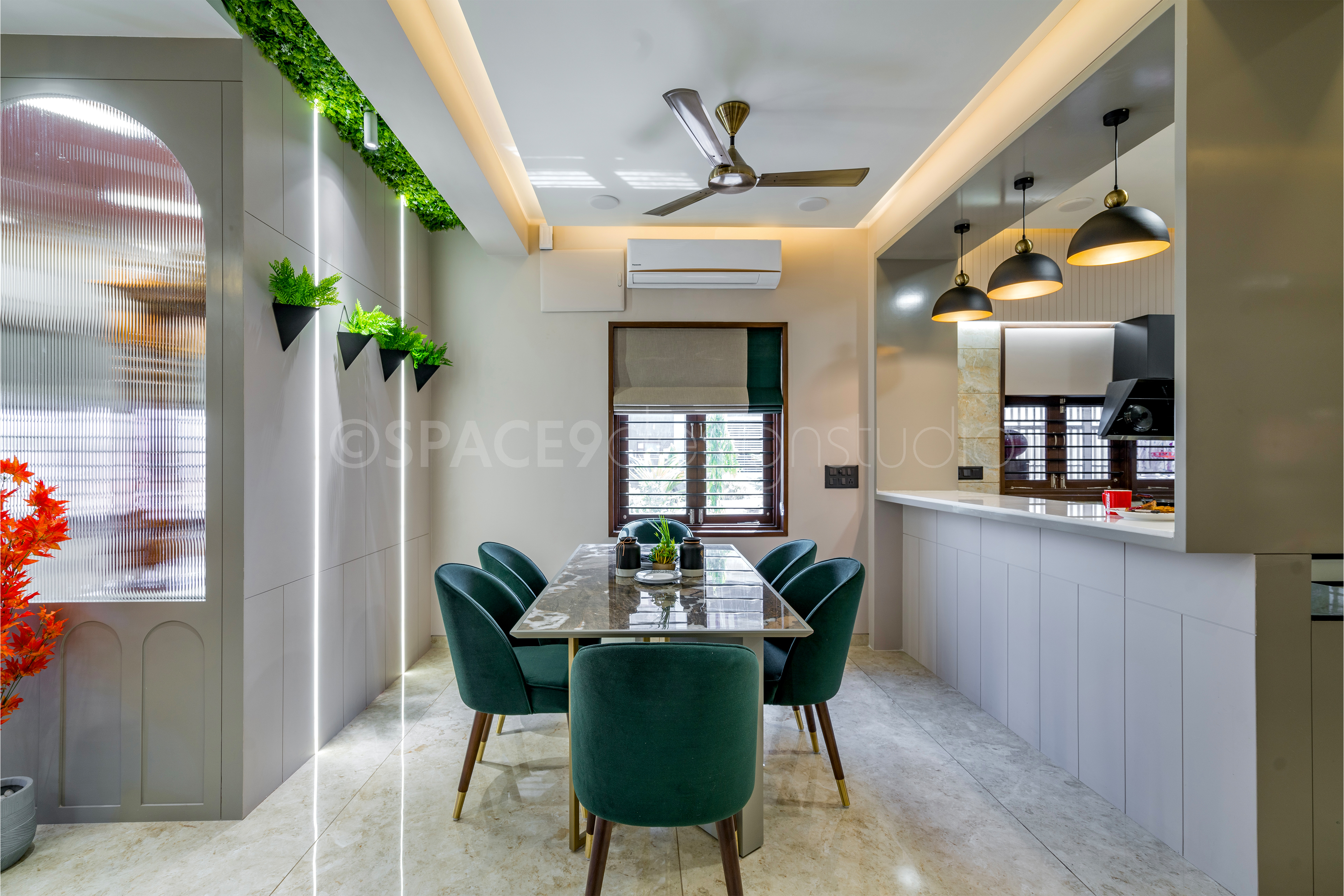 The open dining area and modular kitchen are designed with precision—sleek cabinetry, high-end finishes, and ample natural light make it both practical and aesthetic. Pendant lighting, marble surfaces, and muted tones elevate the dining experience. Each bedroom in the home tells its own story—from a playful, theme-based kids’ room bursting with character, to an elegant master suite adorned with statement lighting and cozy furnishings. The use of bold colours, customized furniture, and artistic details add a unique charm to every room.