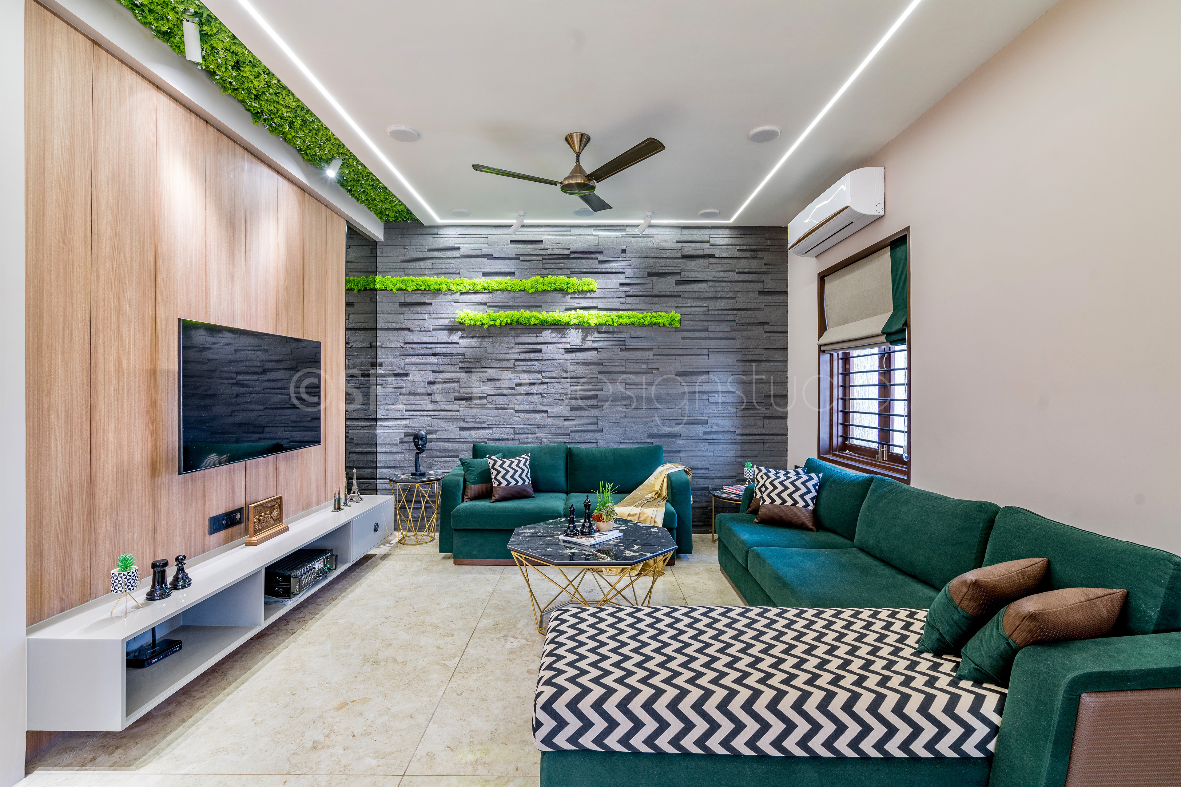 This beautifully crafted bungalow reflects a seamless fusion of contemporary luxury and intelligent design. Each space has been thoughtfully planned to enhance functionality while exuding style and comfort. The living room features a bold interplay of textures, with stone cladding, warm wood finishes, and vibrant green accents that create a welcoming yet sophisticated ambiance.