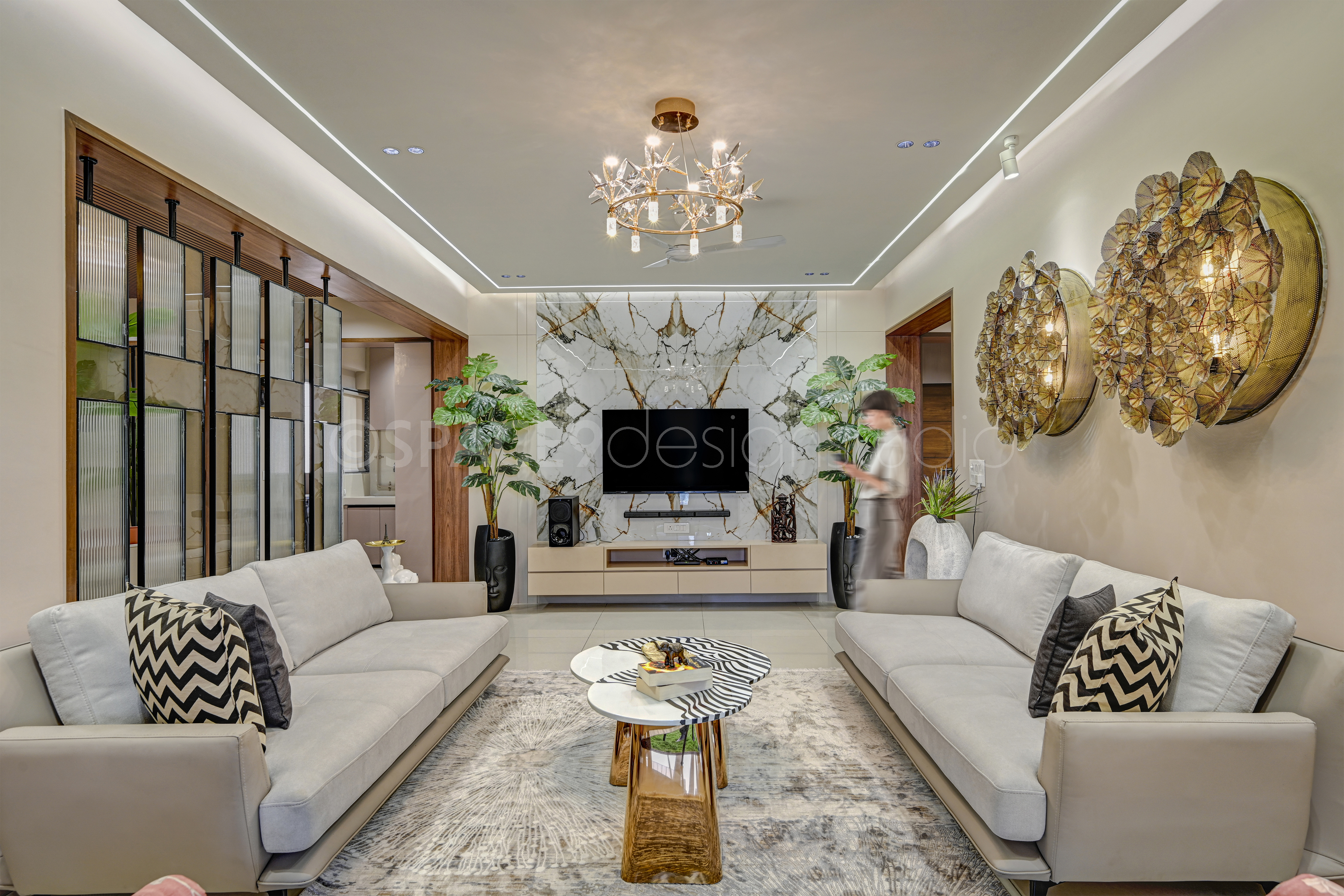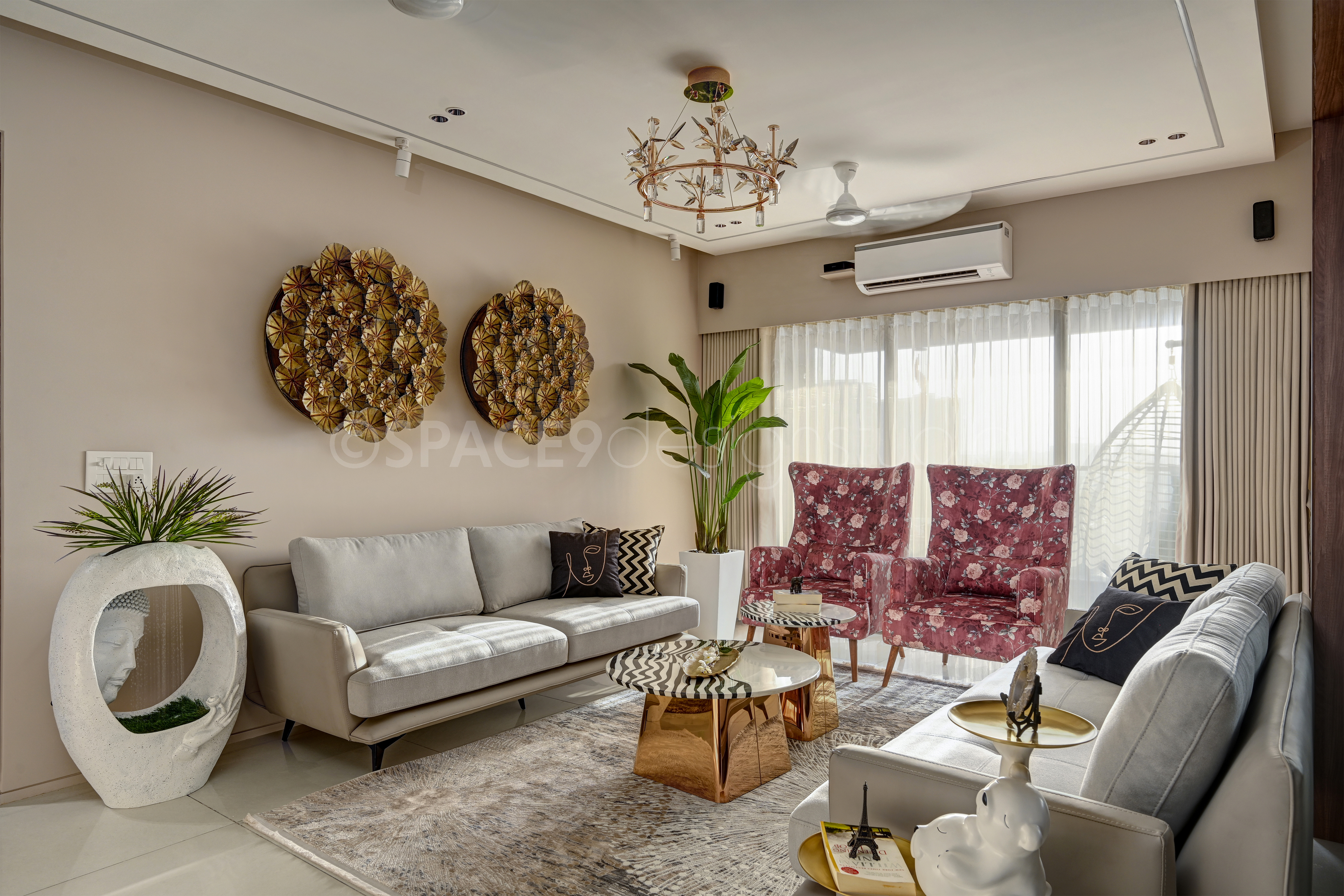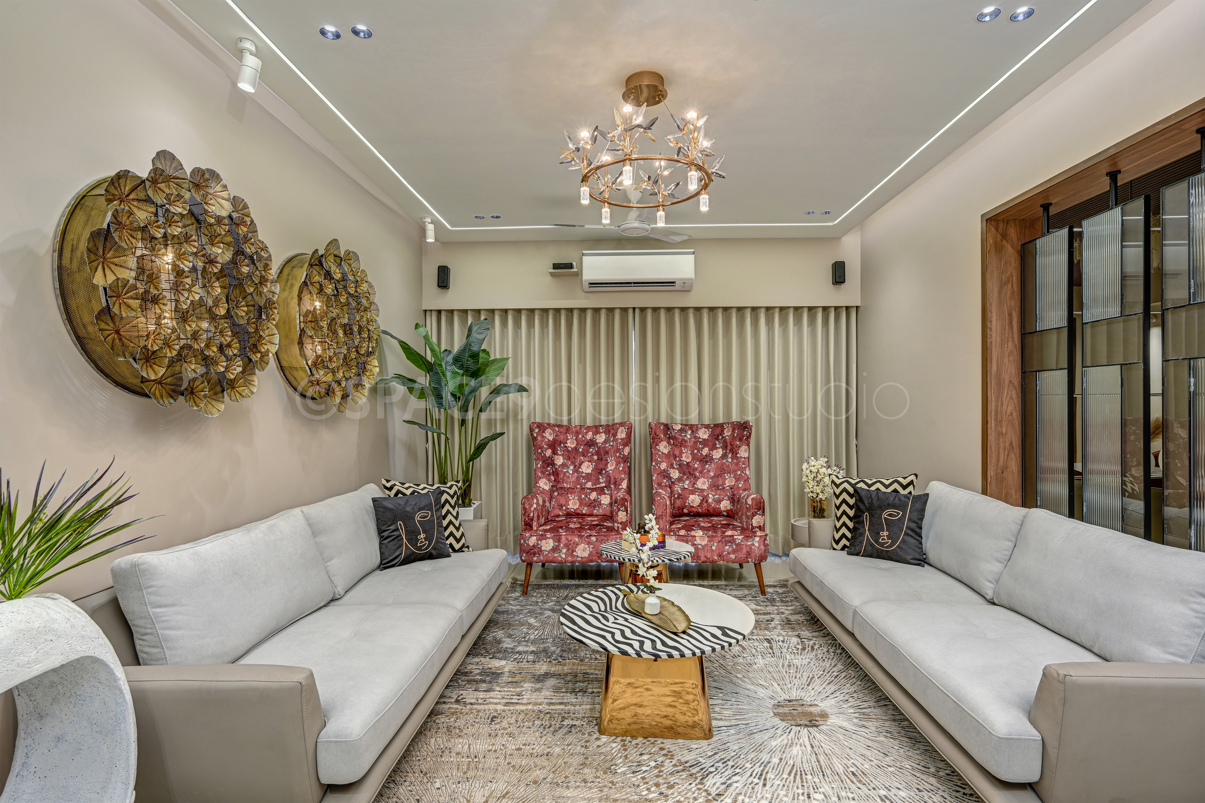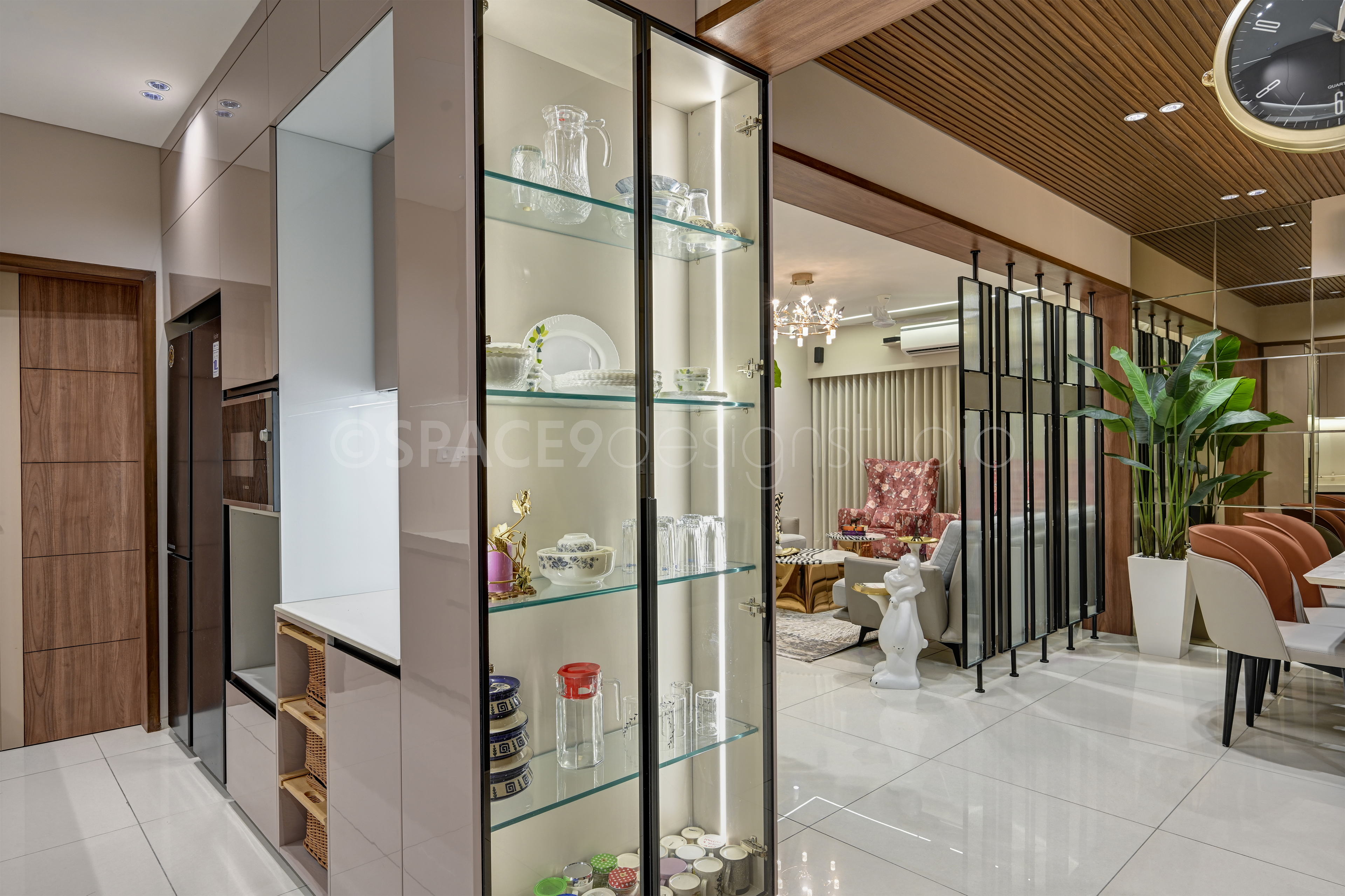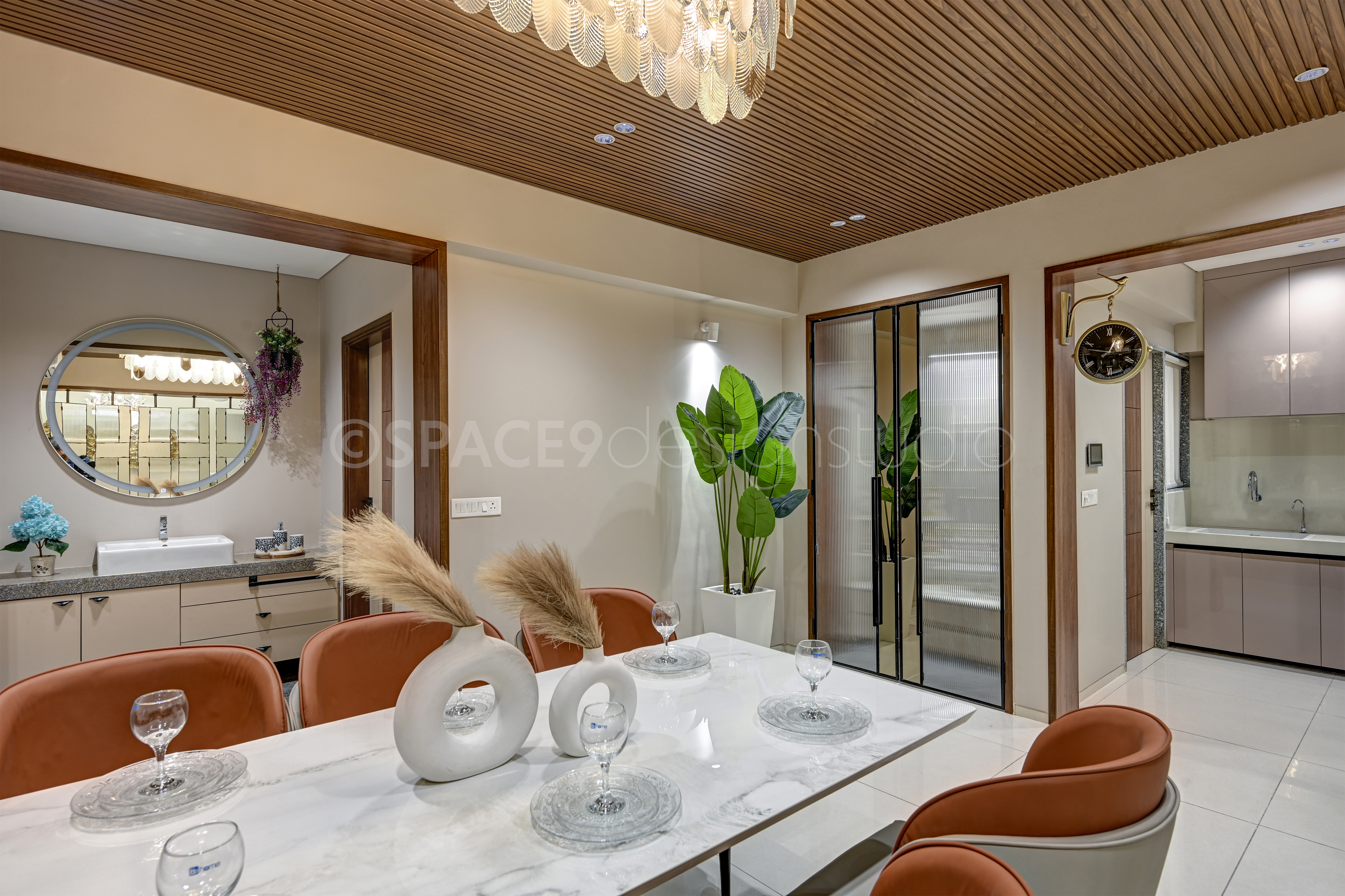 A serene yet sophisticated haven, this 4BHK residence is a masterclass in timeless elegance and contemporary charm. Stepping into the home, one is greeted by a living and dining space bathed in soft beige and crème tones, where natural wood and mirrored accents create an aura of openness and understated luxury. Thoughtfully chosen statement lighting and artful wall décor lend a touch of drama, while lush greenery infuses life and vibrancy into the neutral palette.