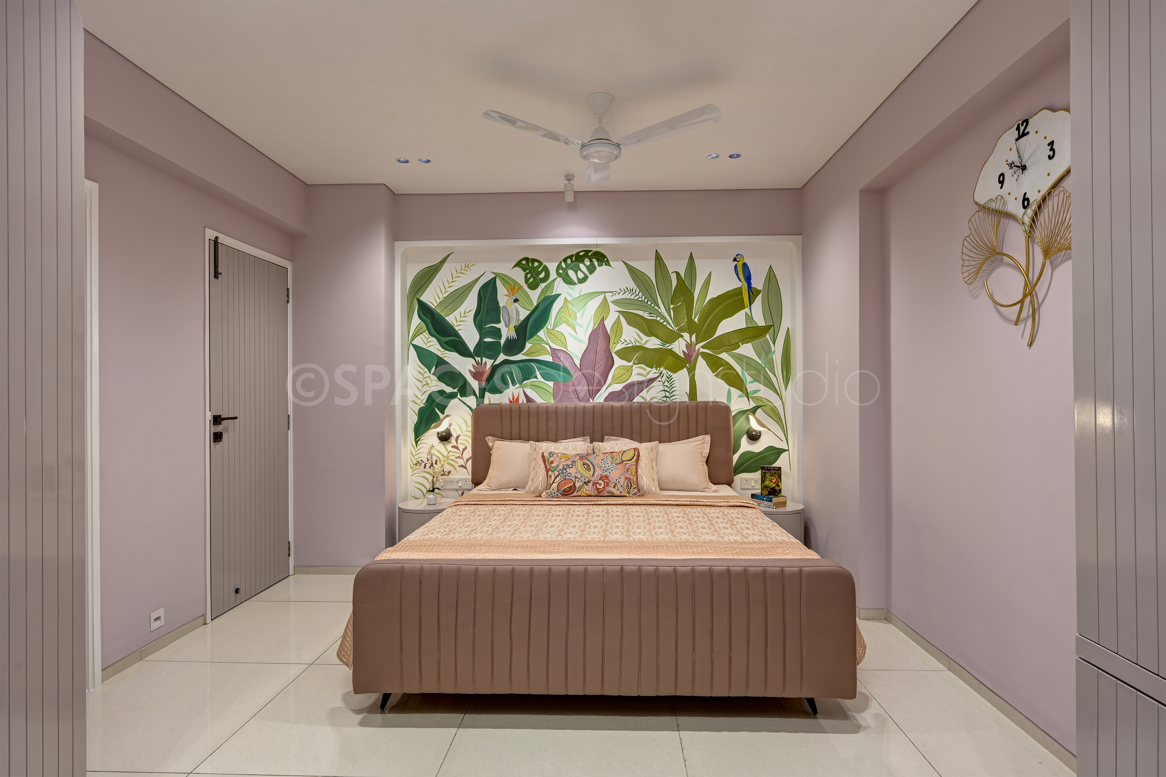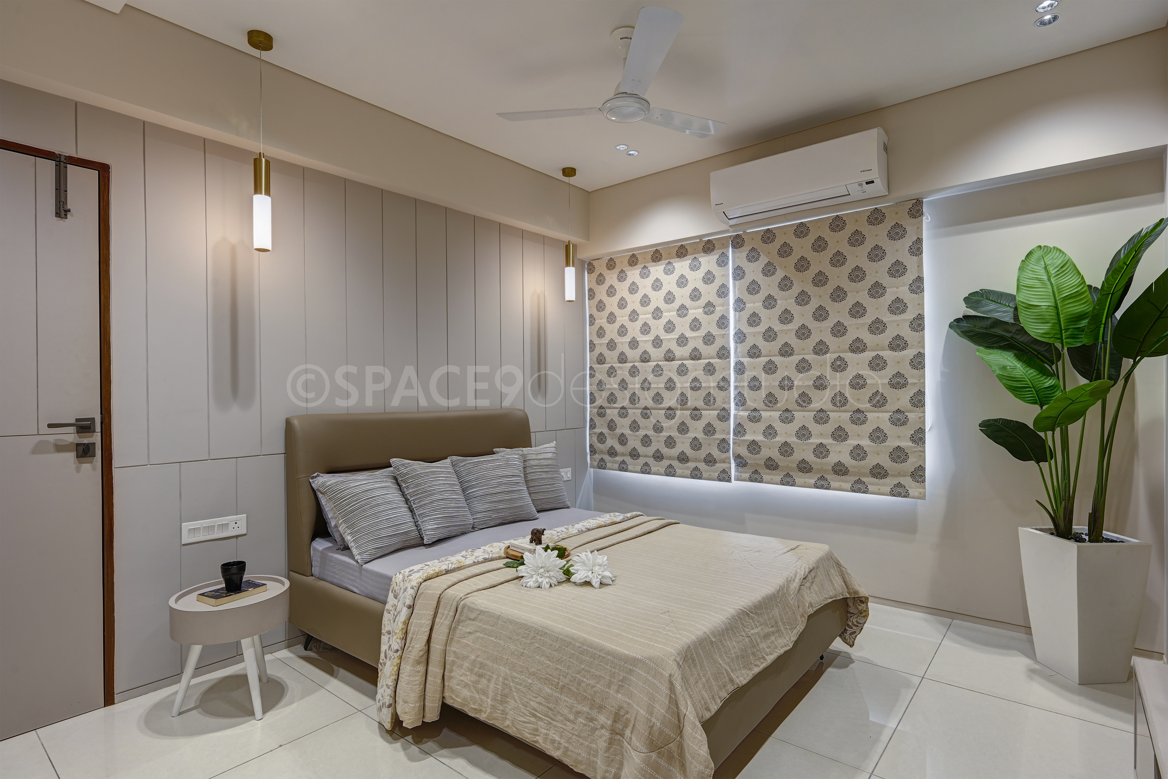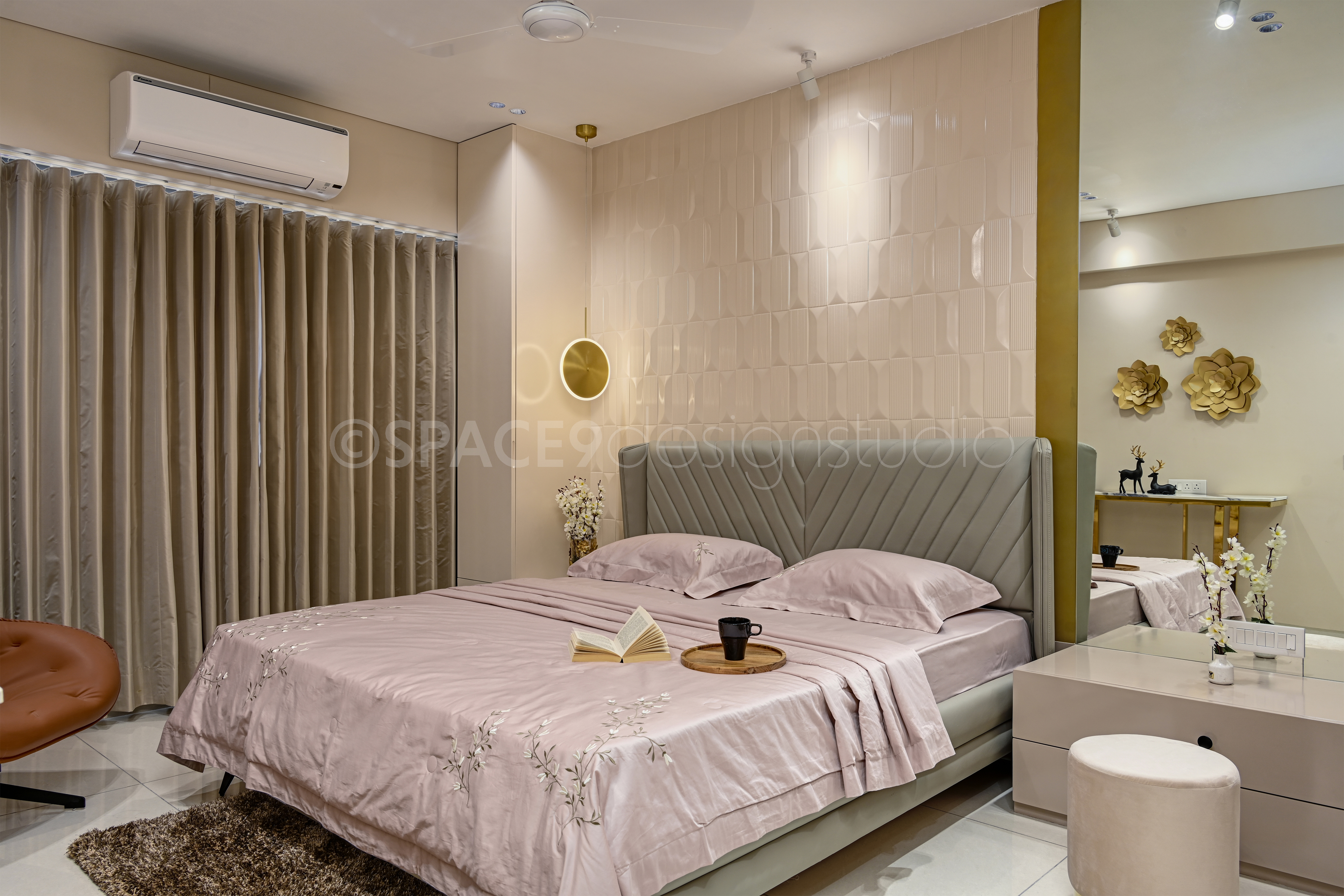 Each bedroom tells its own story while staying true to the home’s tranquil narrative. A botanical feature wall behind the bed brings freshness and playfulness to one space, while another bedroom embraces muted pastels, sleek paneling, and mirrored wardrobes for a calm, restorative retreat. The master suite is undeniably the crown jewel—draped in rich textures, plush bedding, and subtle golden accents, it strikes a perfect balance between indulgence and serenity.The study, meanwhile, is designed as a quiet yet stylish corner for focus and creativity. With its clean-lined desk, ample storage, and modern finishes, it seamlessly blends functionality with design.