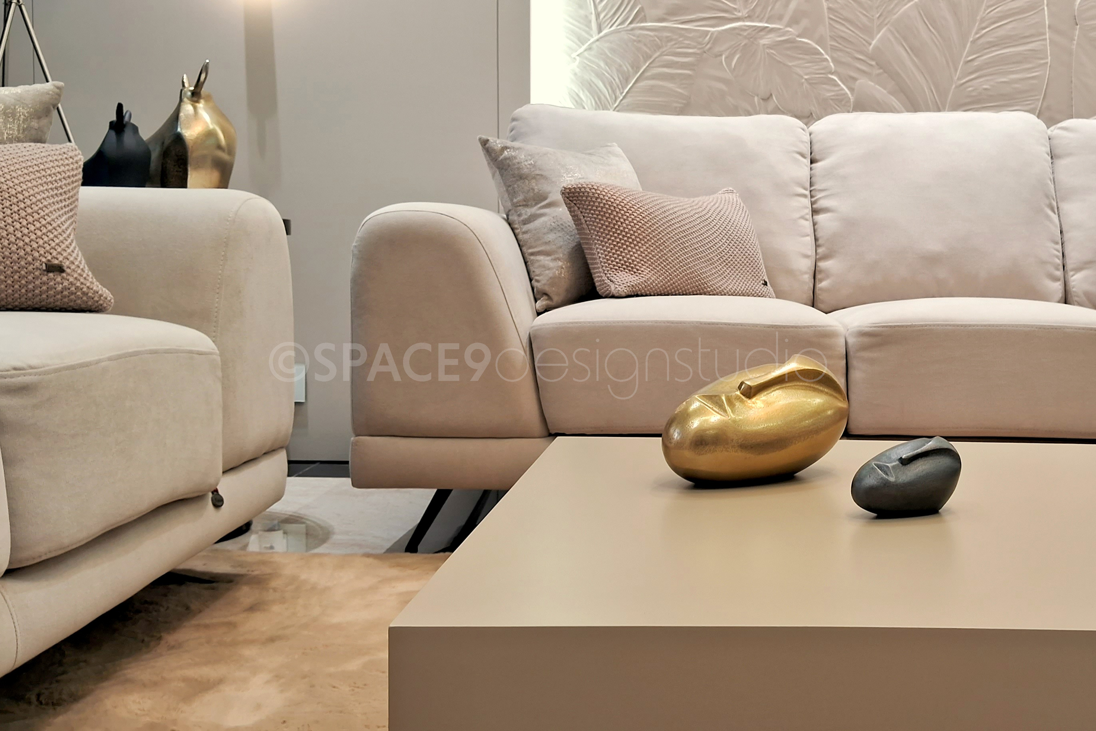 The beige-themed living area with natural flower carved MDF panel finished in PU finish color exudes sophistication and elegance. The soft hue of beige on the walls and furniture creates a calm and relaxing atmosphere, making it the perfect place to unwind after a long day. The natural flower carved MDF panel adds an element of nature to the room, bringing in a sense of tranquility. The PU finish adds a glossy touch to the panel, giving it a luxurious look. The combination of these elements creates a harmonious vibe that is pleasing to the eye. Overall, this living area is a beautiful example of a well-designed space that invites comfort and relaxation. The living and drawing area of this beautifully designed space is a harmonious blend of classic elegance and modern sophistication.