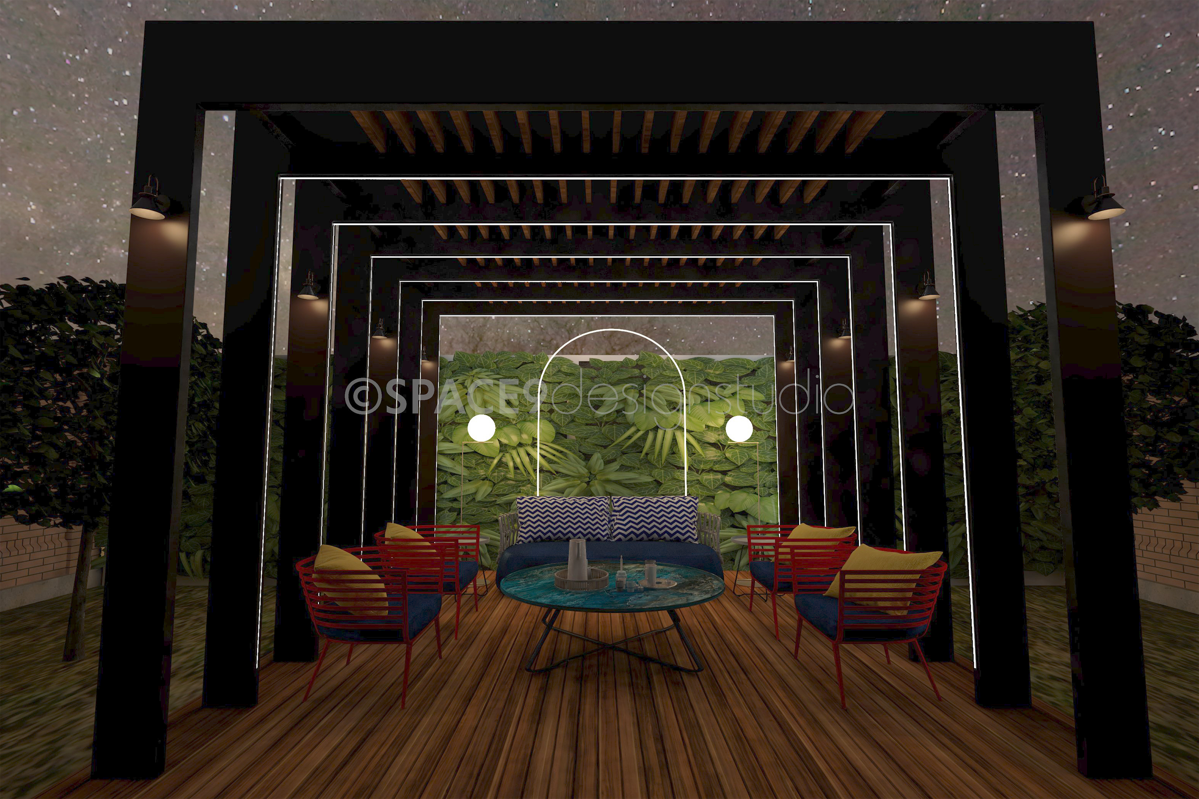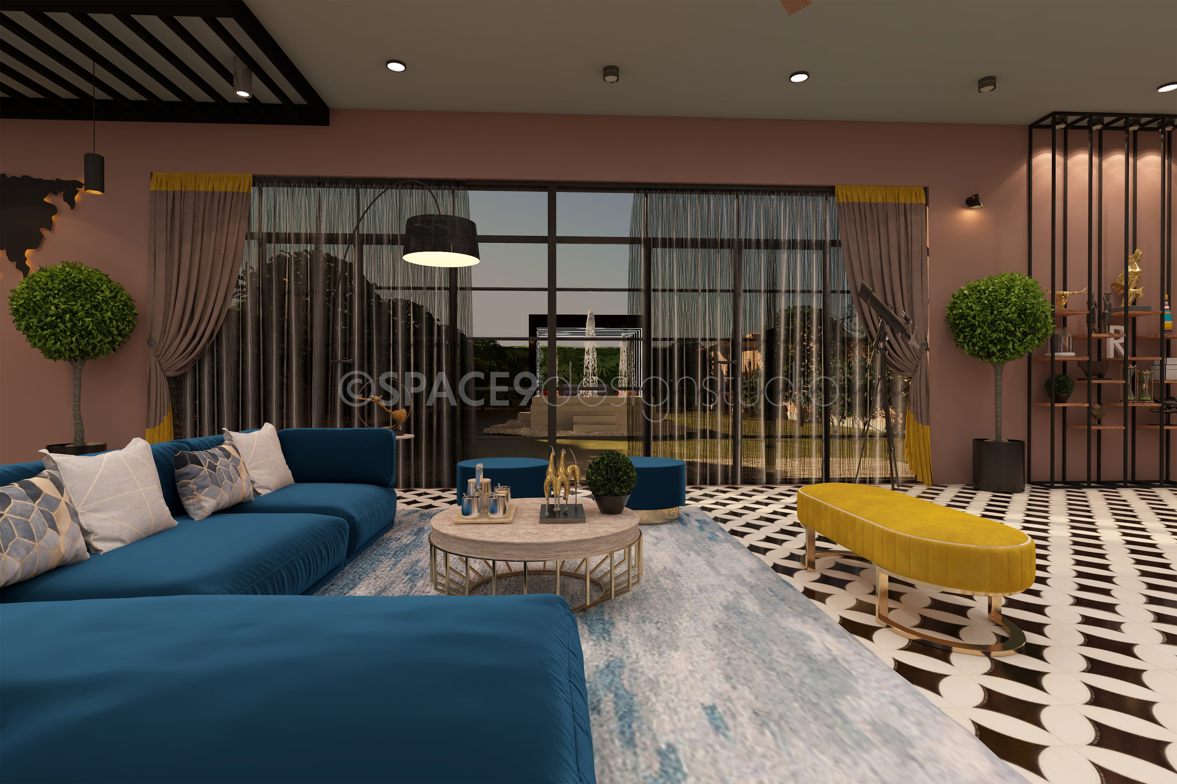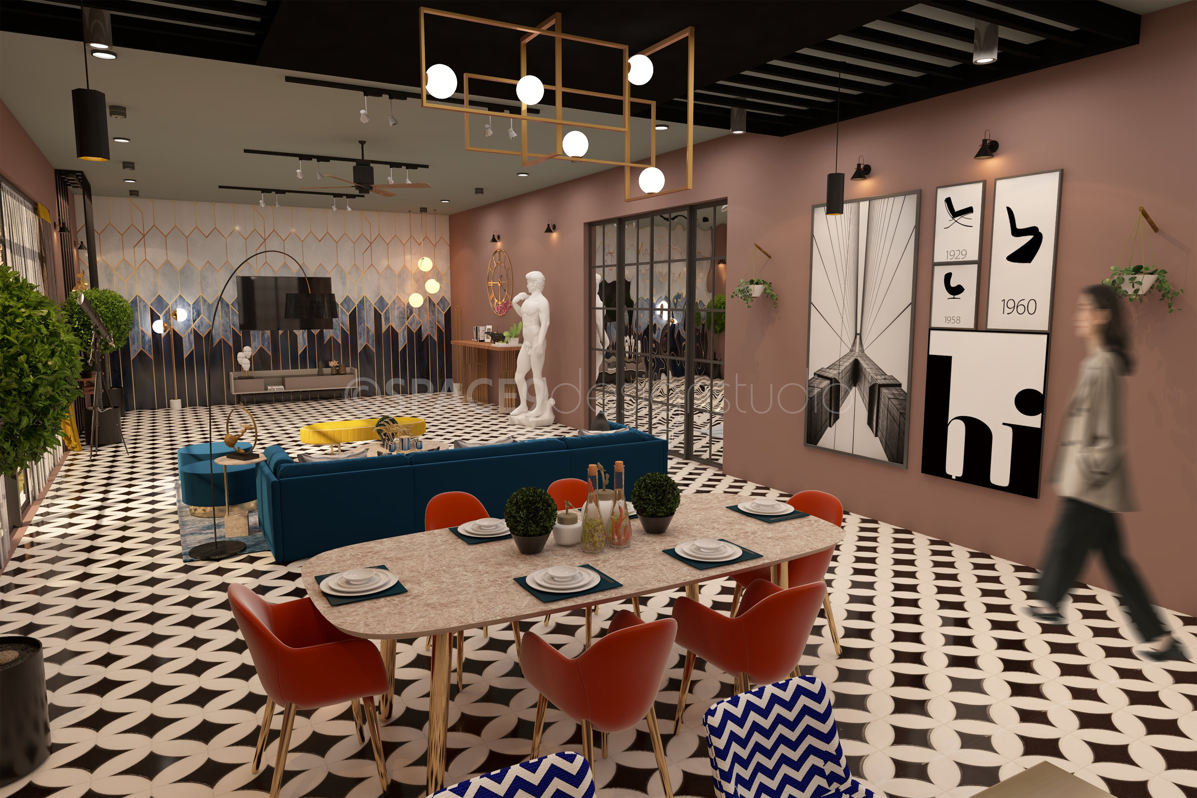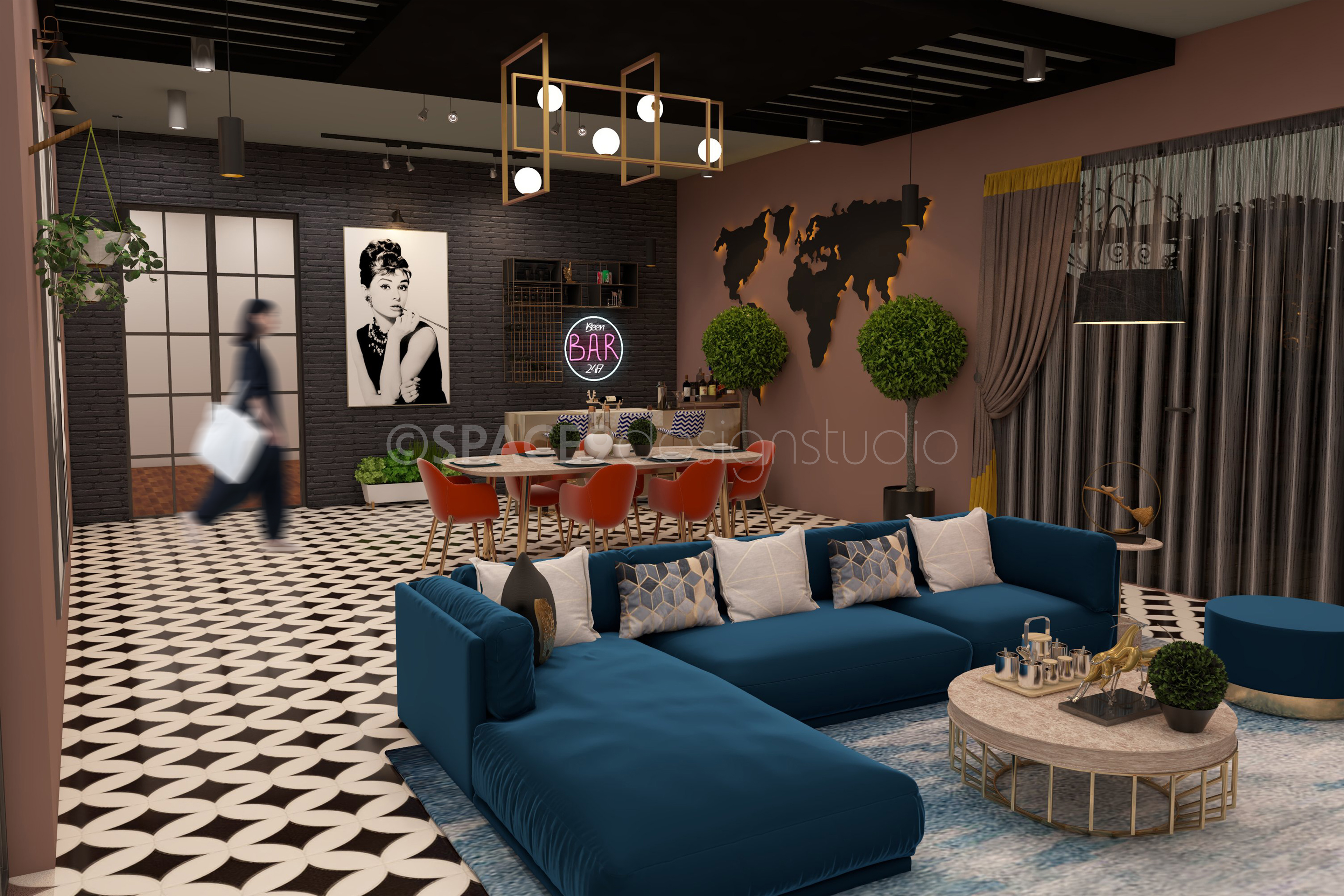 Art pieces, including monochrome portraits and abstract wall décor, add a contemporary edge, while statement lighting fixtures infuse glamour and drama. Large windows with sheer curtains allow natural light to filter in, balancing the richness of the palette with openness and airiness. From the bar nook with neon signage to the grand statue centerpiece, the villa reflects personality and playfulness. This design seamlessly merges modern luxury with artistic flair, making it an inspiring retreat.