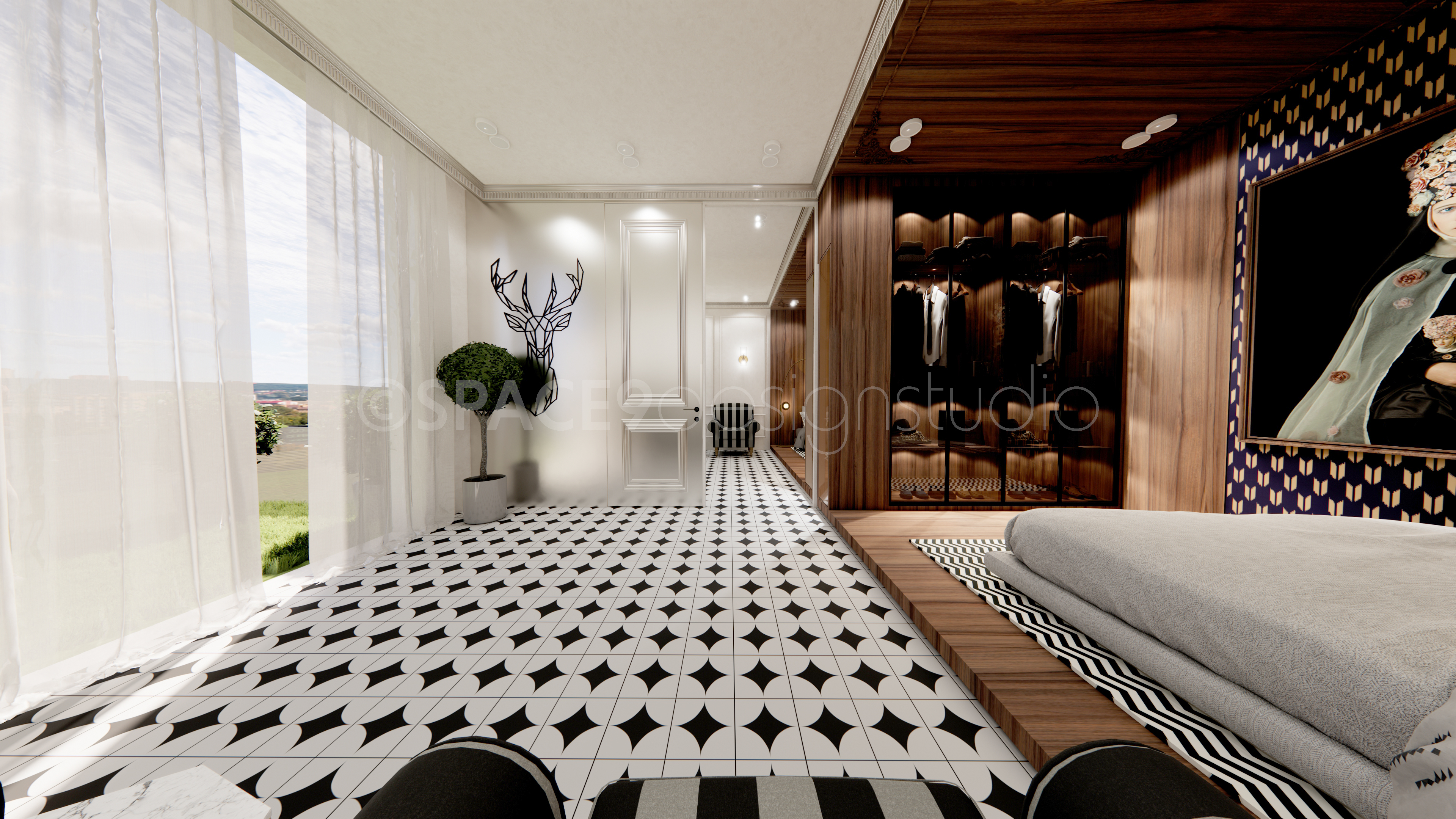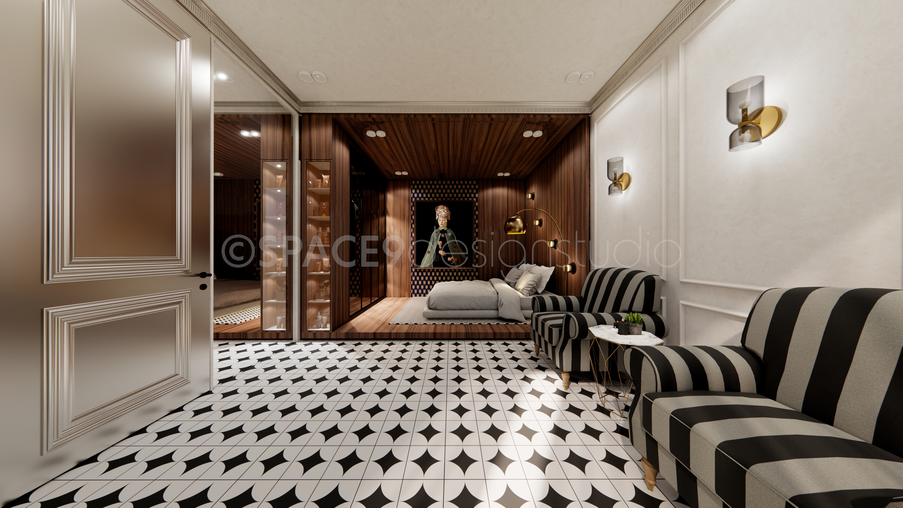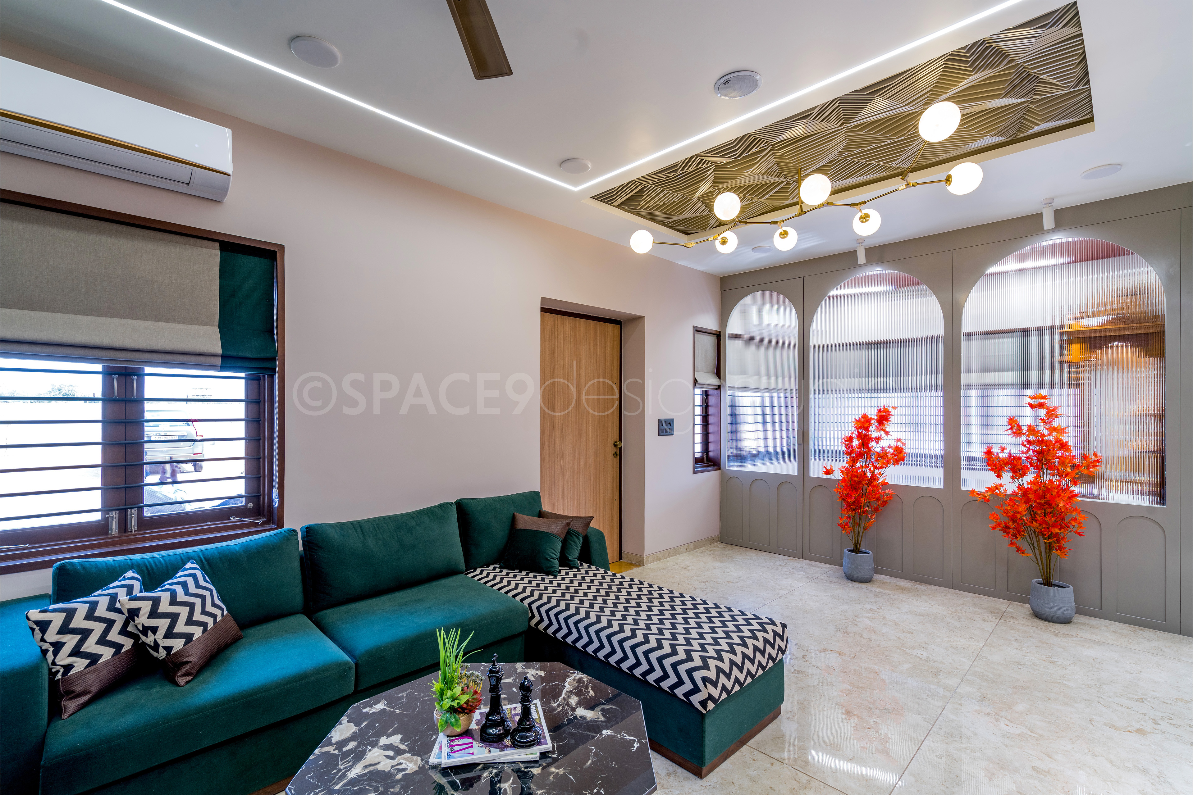 This beautifully crafted bungalow reflects a seamless fusion of contemporary luxury and intelligent design. Each space has been thoughtfully planned to enhance functionality while exuding style and comfort. The living room features a bold interplay of textures, with stone cladding, warm wood finishes, and vibrant green accents that create a welcoming yet sophisticated ambiance.