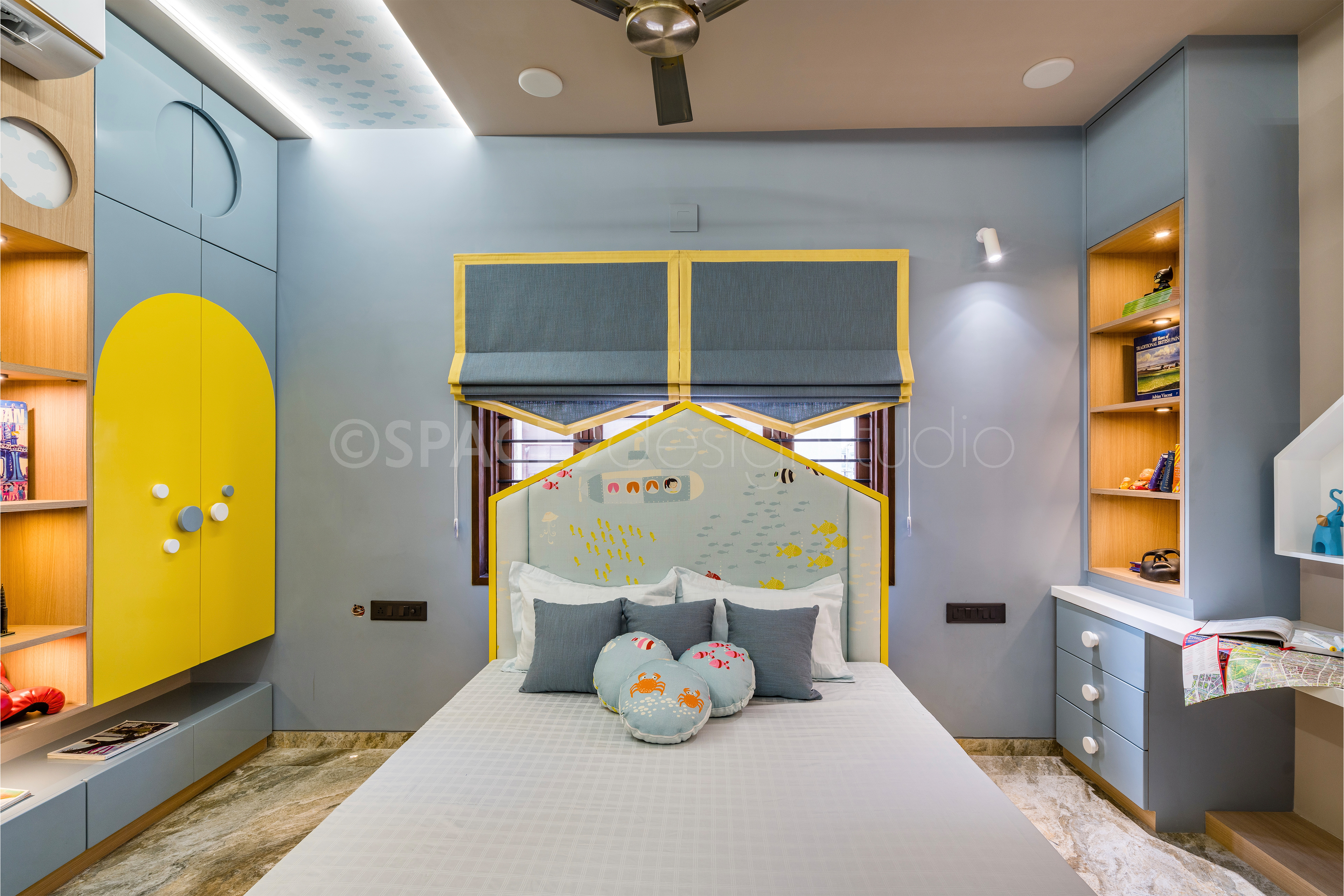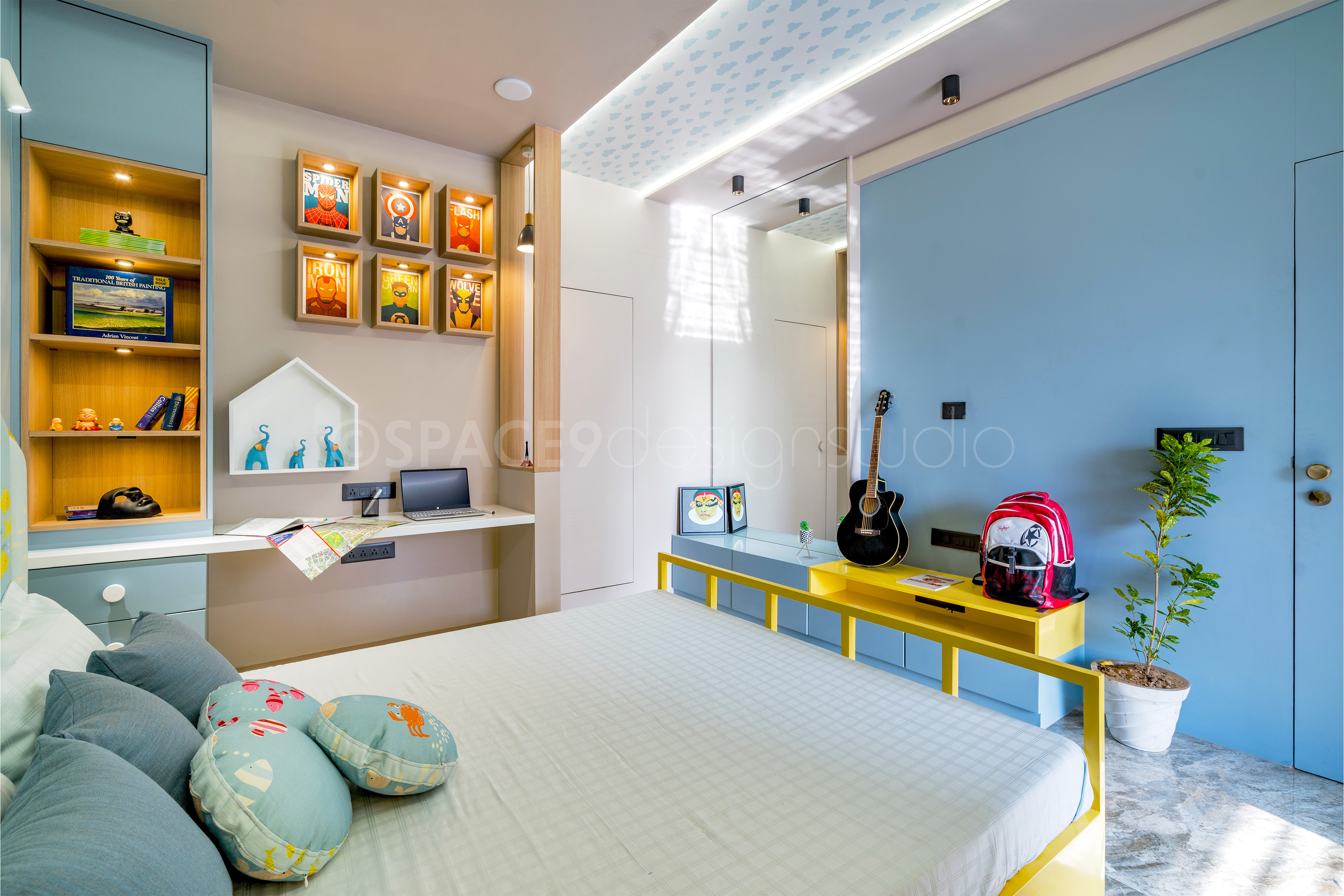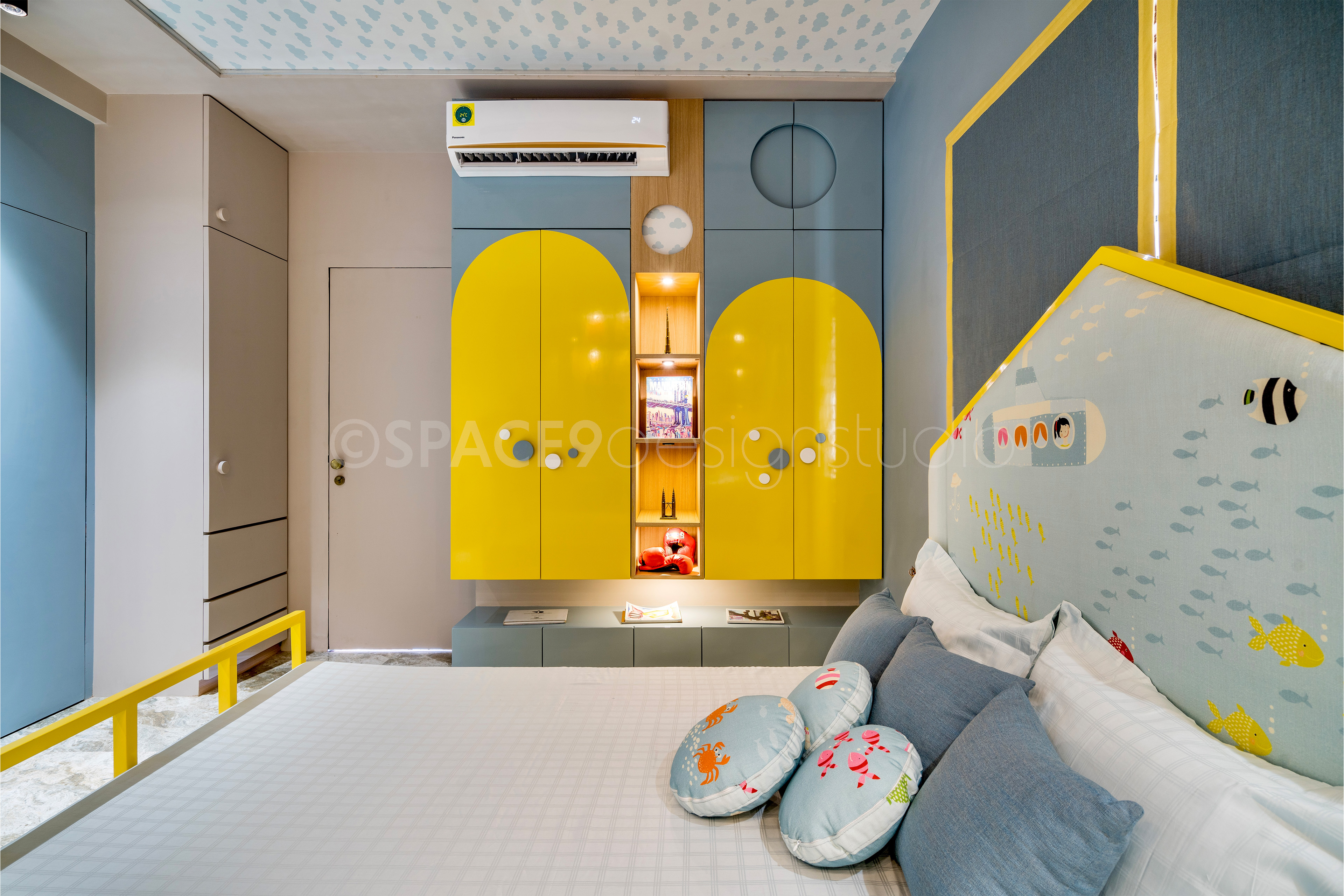 The open dining area and modular kitchen are designed with precision—sleek cabinetry, high-end finishes, and ample natural light make it both practical and aesthetic. Pendant lighting, marble surfaces, and muted tones elevate the dining experience. Each bedroom in the home tells its own story—from a playful, theme-based kids’ room bursting with character, to an elegant master suite adorned with statement lighting and cozy furnishings. The use of bold colours, customized furniture, and artistic details add a unique charm to every room.