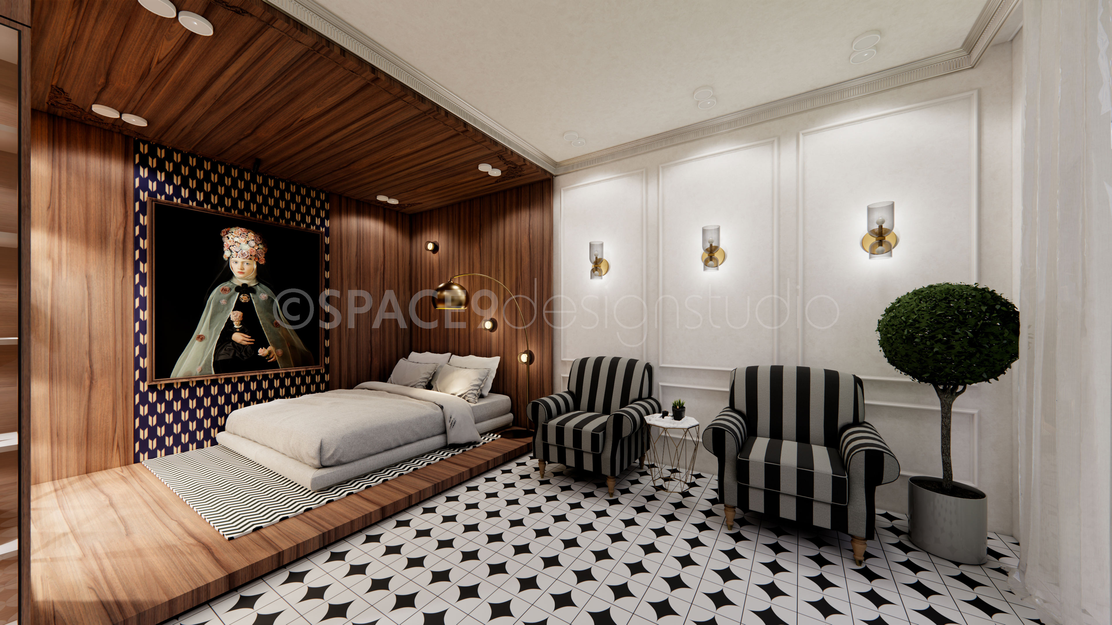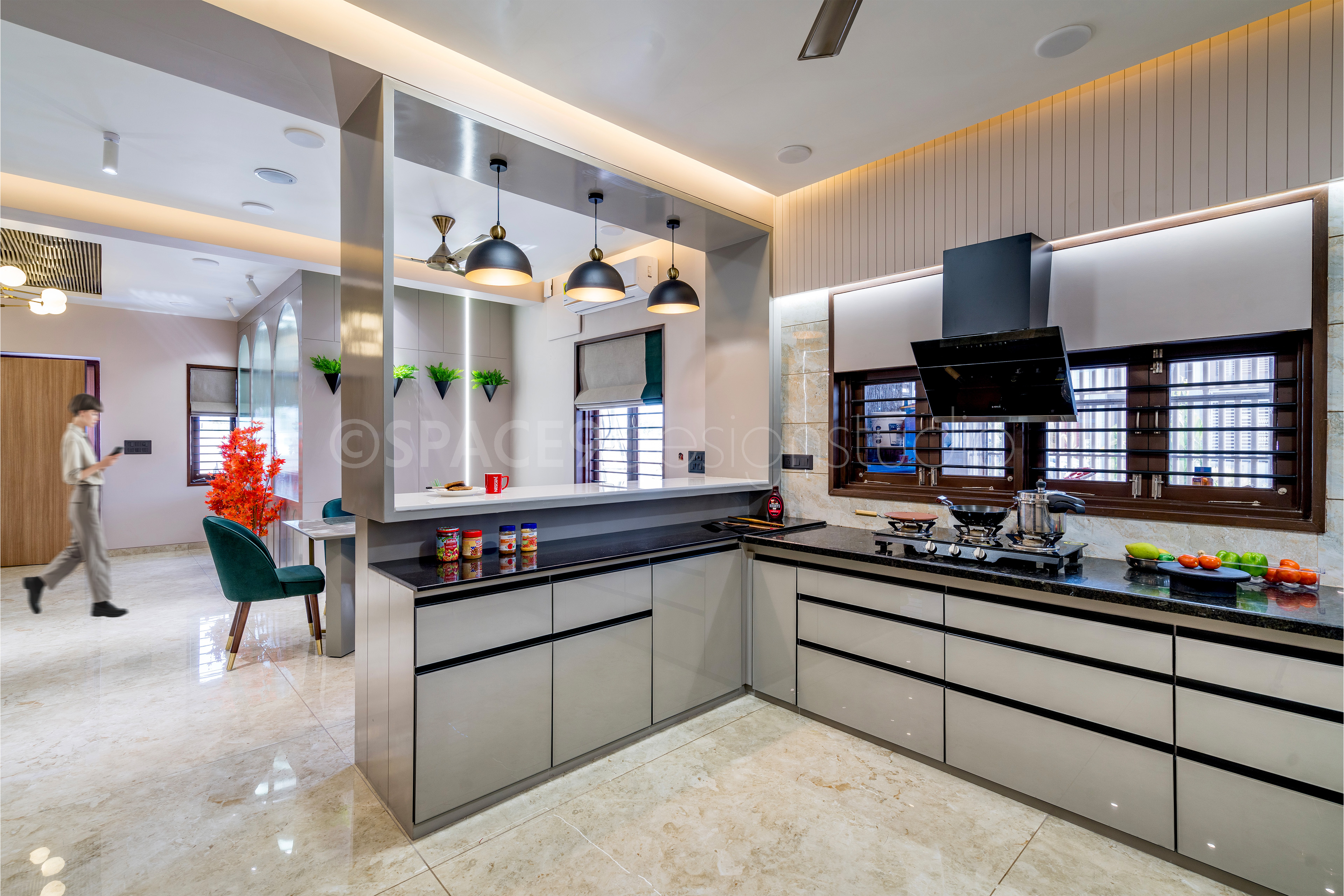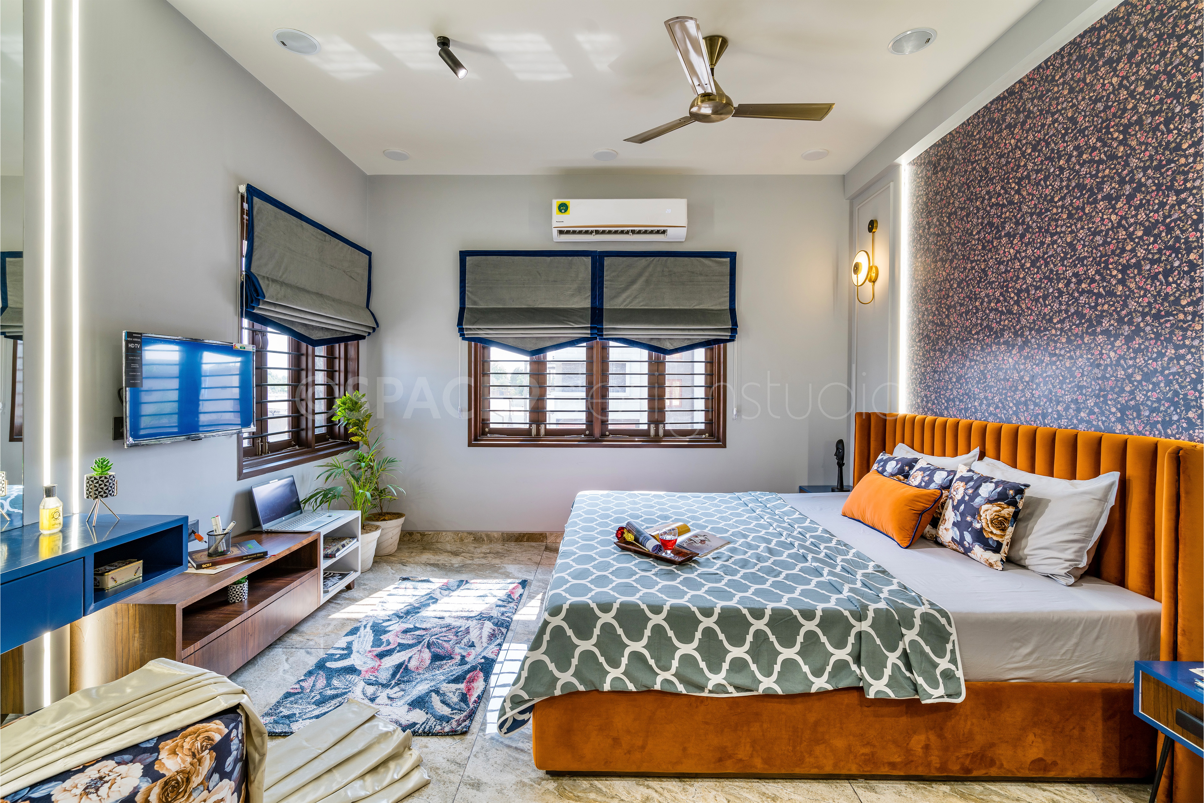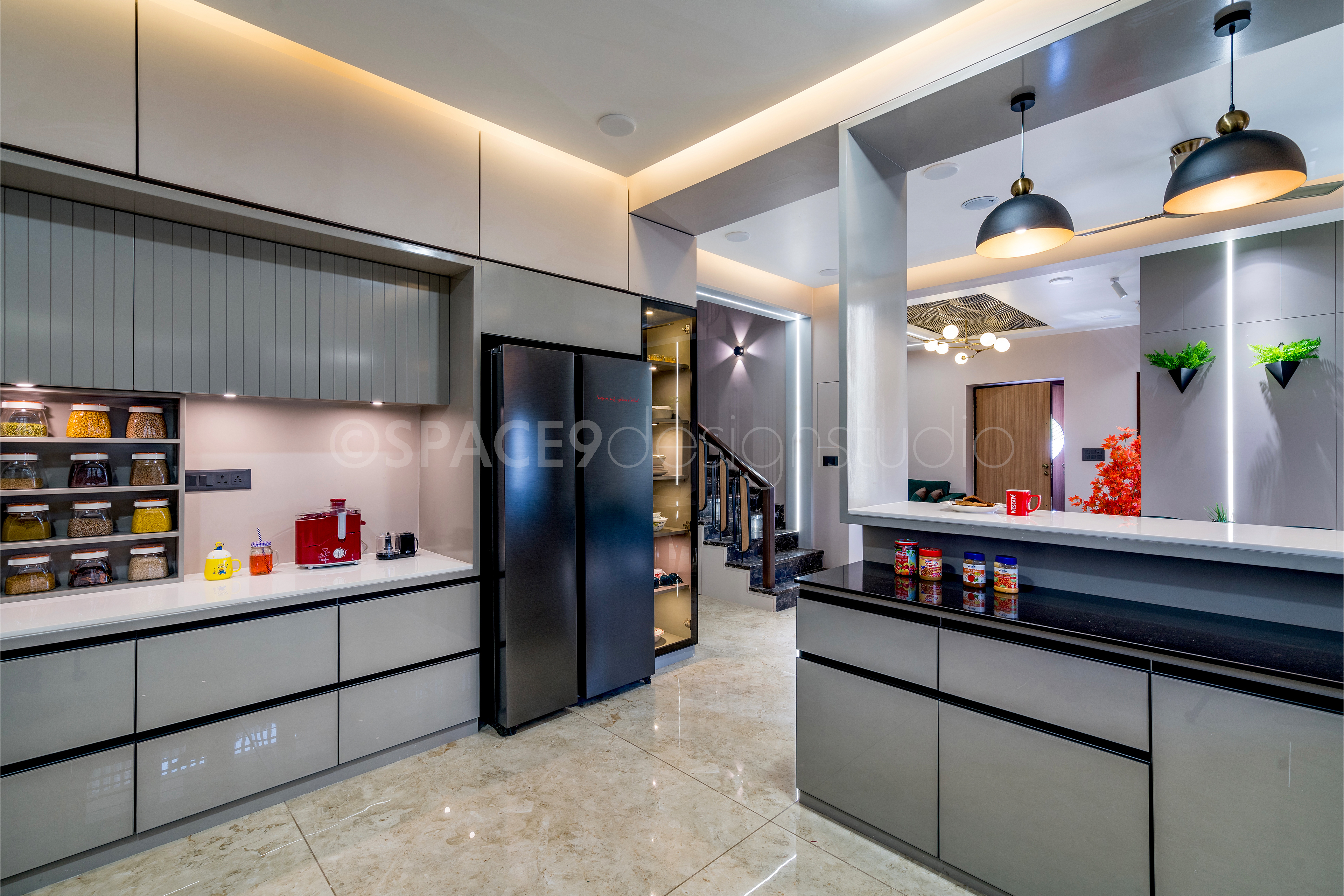 The open dining area and modular kitchen are designed with precision—sleek cabinetry, high-end finishes, and ample natural light make it both practical and aesthetic. Pendant lighting, marble surfaces, and muted tones elevate the dining experience. Each bedroom in the home tells its own story—from a playful, theme-based kids’ room bursting with character, to an elegant master suite adorned with statement lighting and cozy furnishings. The use of bold colours, customized furniture, and artistic details add a unique charm to every room.