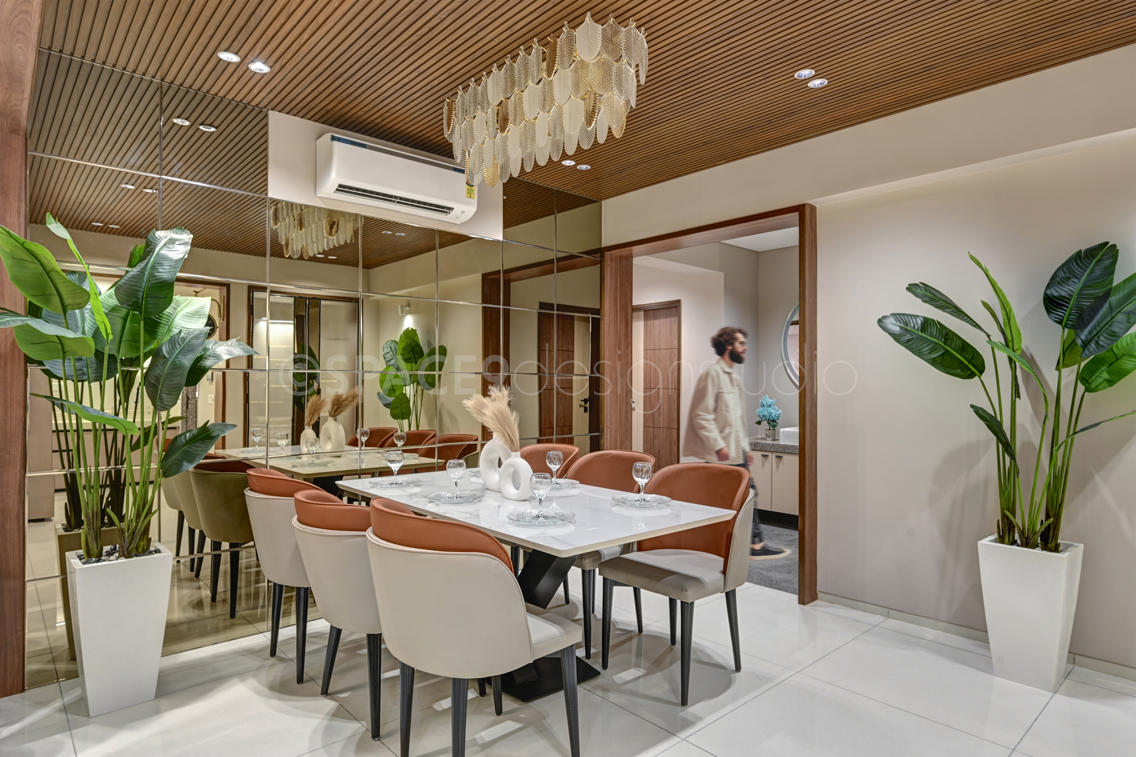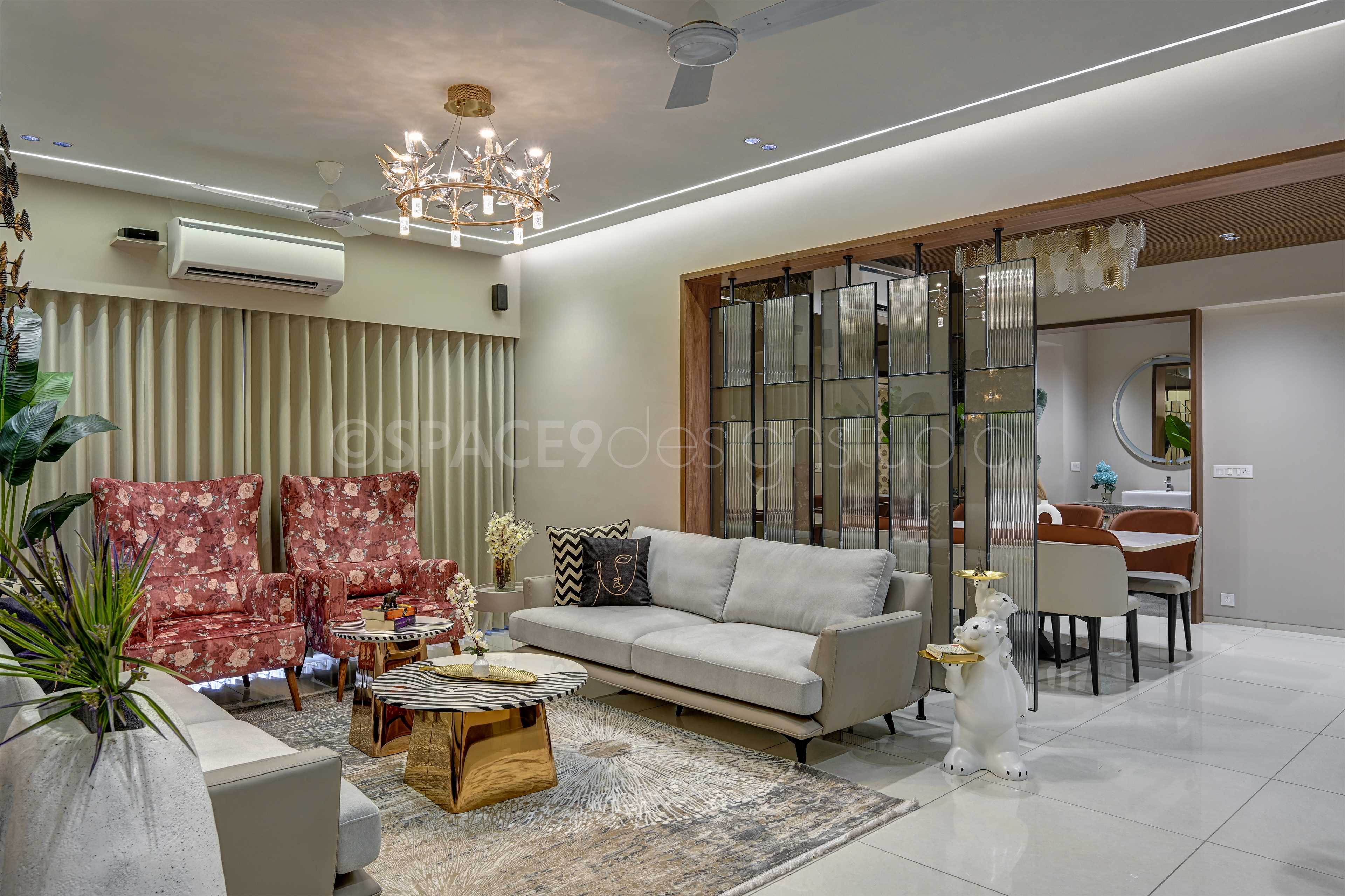 A serene yet sophisticated haven, this 4BHK residence is a masterclass in timeless elegance and contemporary charm. Stepping into the home, one is greeted by a living and dining space bathed in soft beige and crème tones, where natural wood and mirrored accents create an aura of openness and understated luxury. Thoughtfully chosen statement lighting and artful wall décor lend a touch of drama, while lush greenery infuses life and vibrancy into the neutral palette.