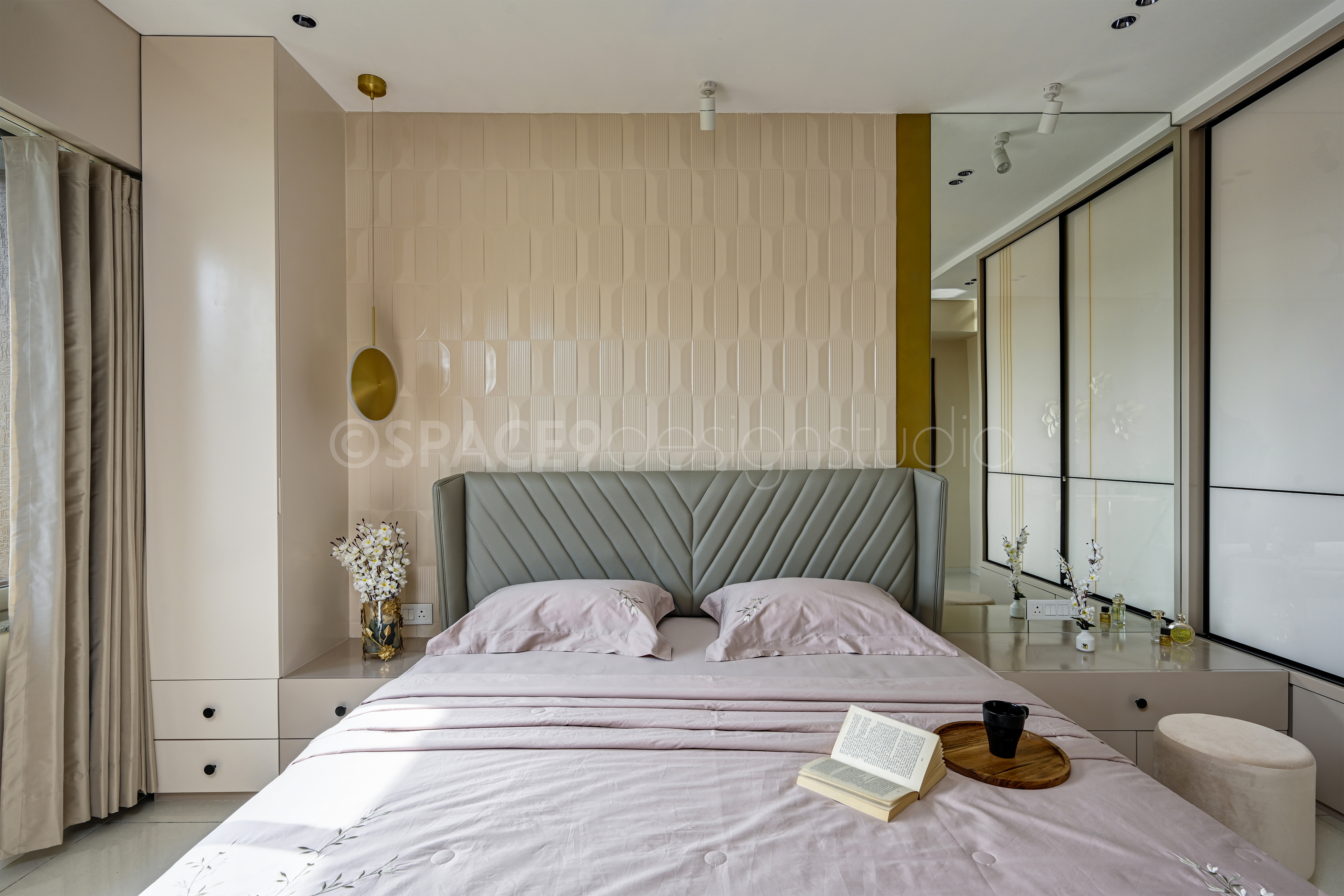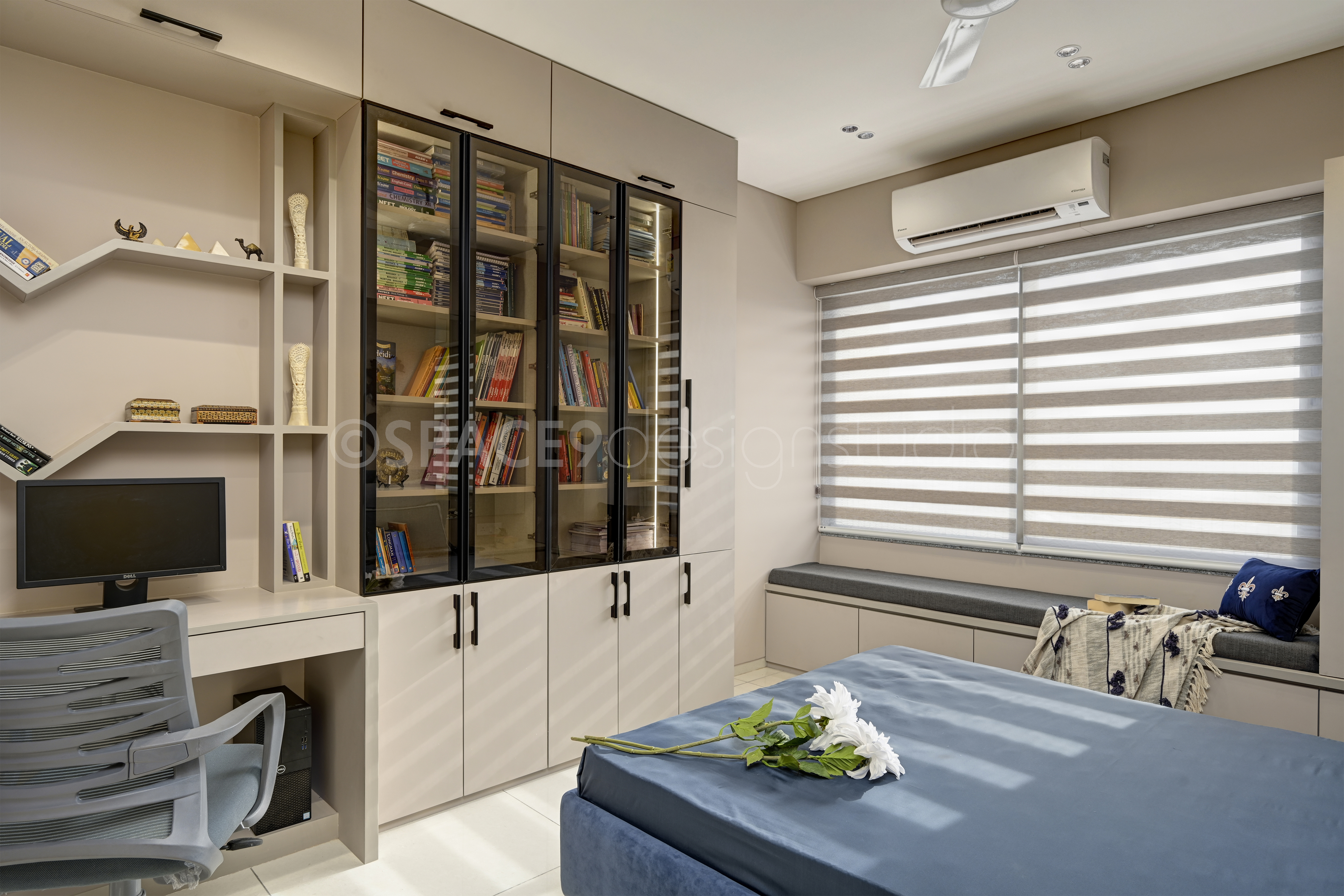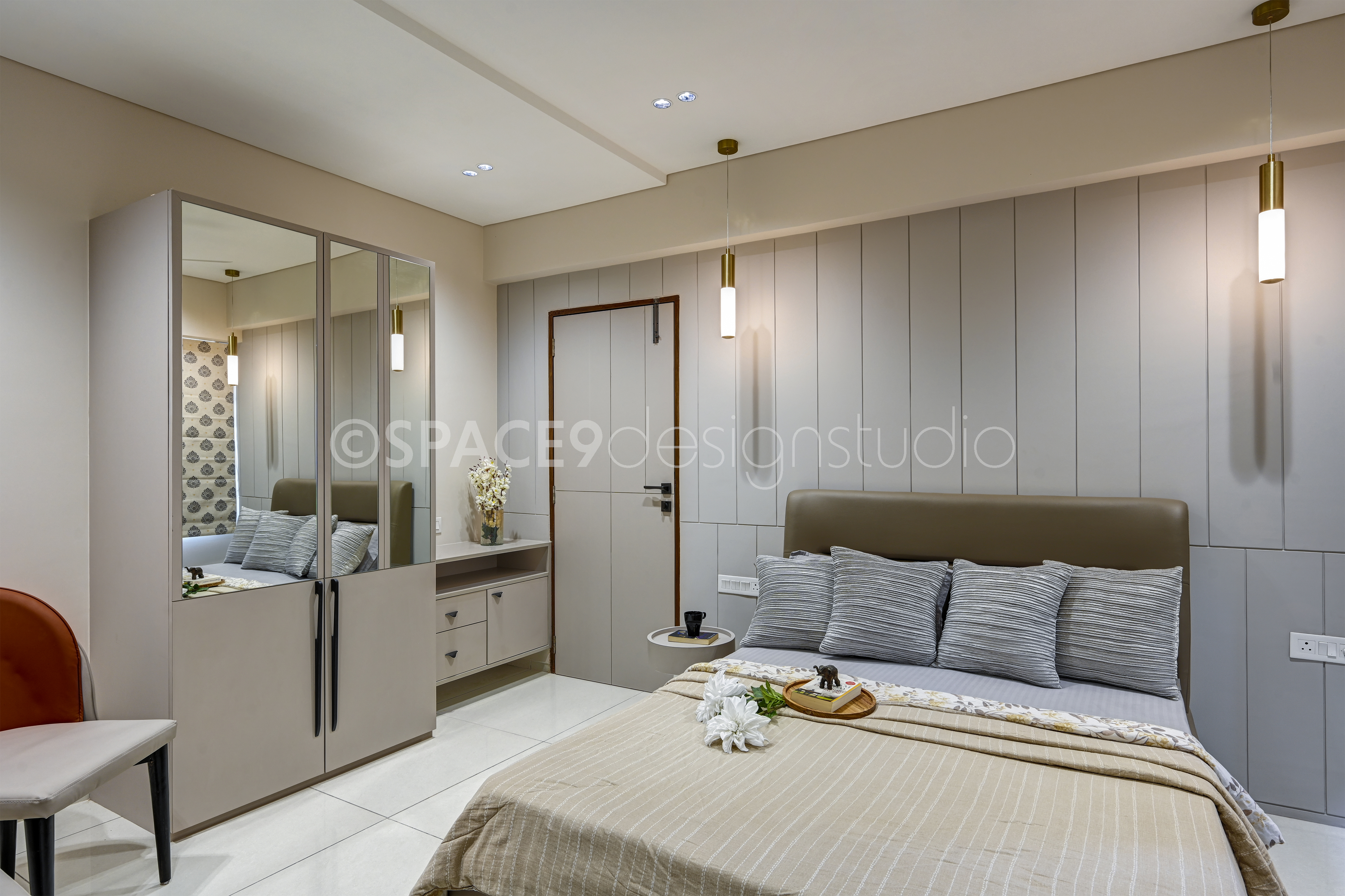 Each bedroom tells its own story while staying true to the home’s tranquil narrative. A botanical feature wall behind the bed brings freshness and playfulness to one space, while another bedroom embraces muted pastels, sleek paneling, and mirrored wardrobes for a calm, restorative retreat. The master suite is undeniably the crown jewel—draped in rich textures, plush bedding, and subtle golden accents, it strikes a perfect balance between indulgence and serenity.The study, meanwhile, is designed as a quiet yet stylish corner for focus and creativity. With its clean-lined desk, ample storage, and modern finishes, it seamlessly blends functionality with design.