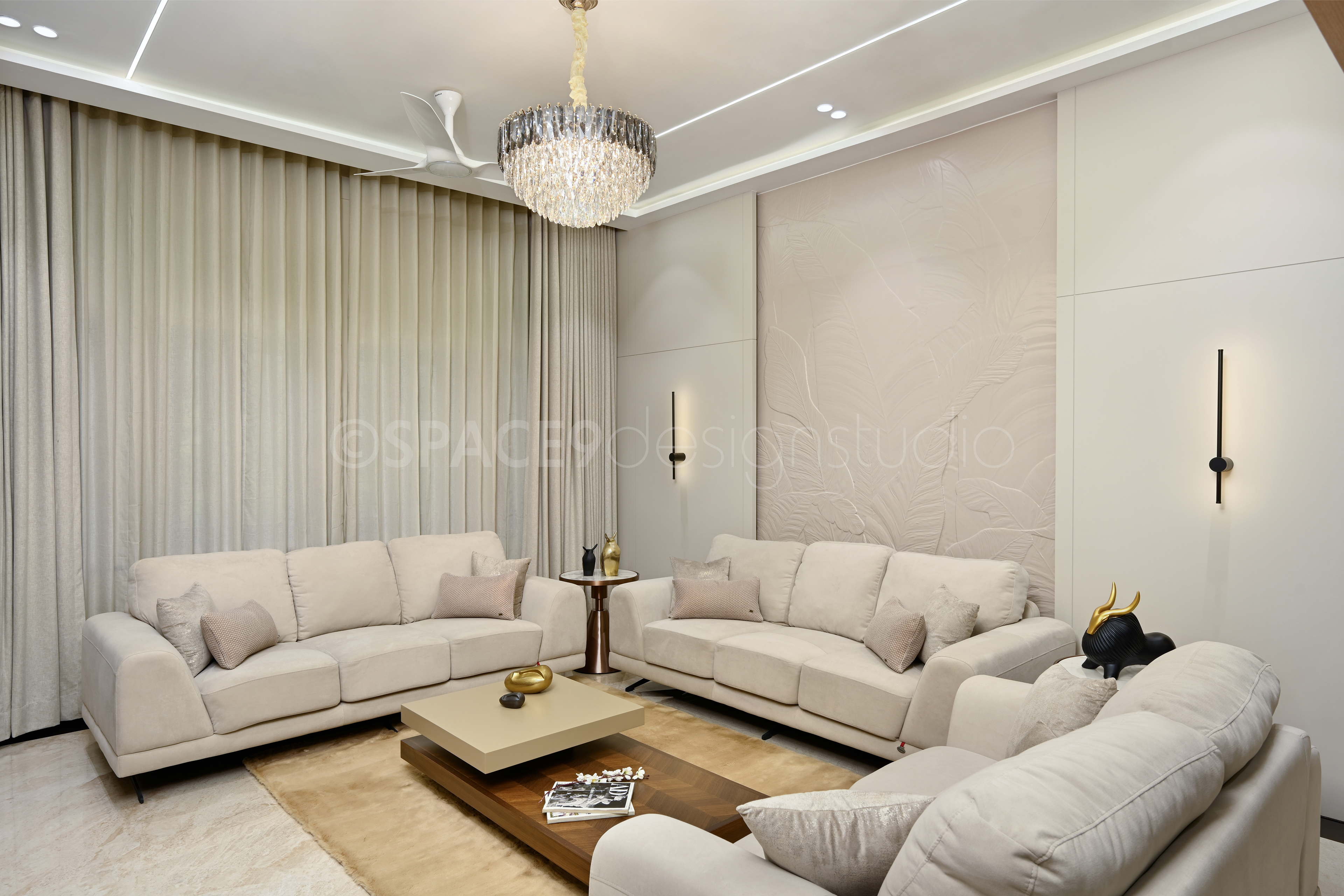 The beige-themed living area with natural flower carved MDF panel finished in PU finish color exudes sophistication and elegance. The soft hue of beige on the walls and furniture creates a calm and relaxing atmosphere, making it the perfect place to unwind after a long day. The natural flower carved MDF panel adds an element of nature to the room, bringing in a sense of tranquility. The PU finish adds a glossy touch to the panel, giving it a luxurious look. The combination of these elements creates a harmonious vibe that is pleasing to the eye. Overall, this living area is a beautiful example of a well-designed space that invites comfort and relaxation. The living and drawing area of this beautifully designed space is a harmonious blend of classic elegance and modern sophistication.