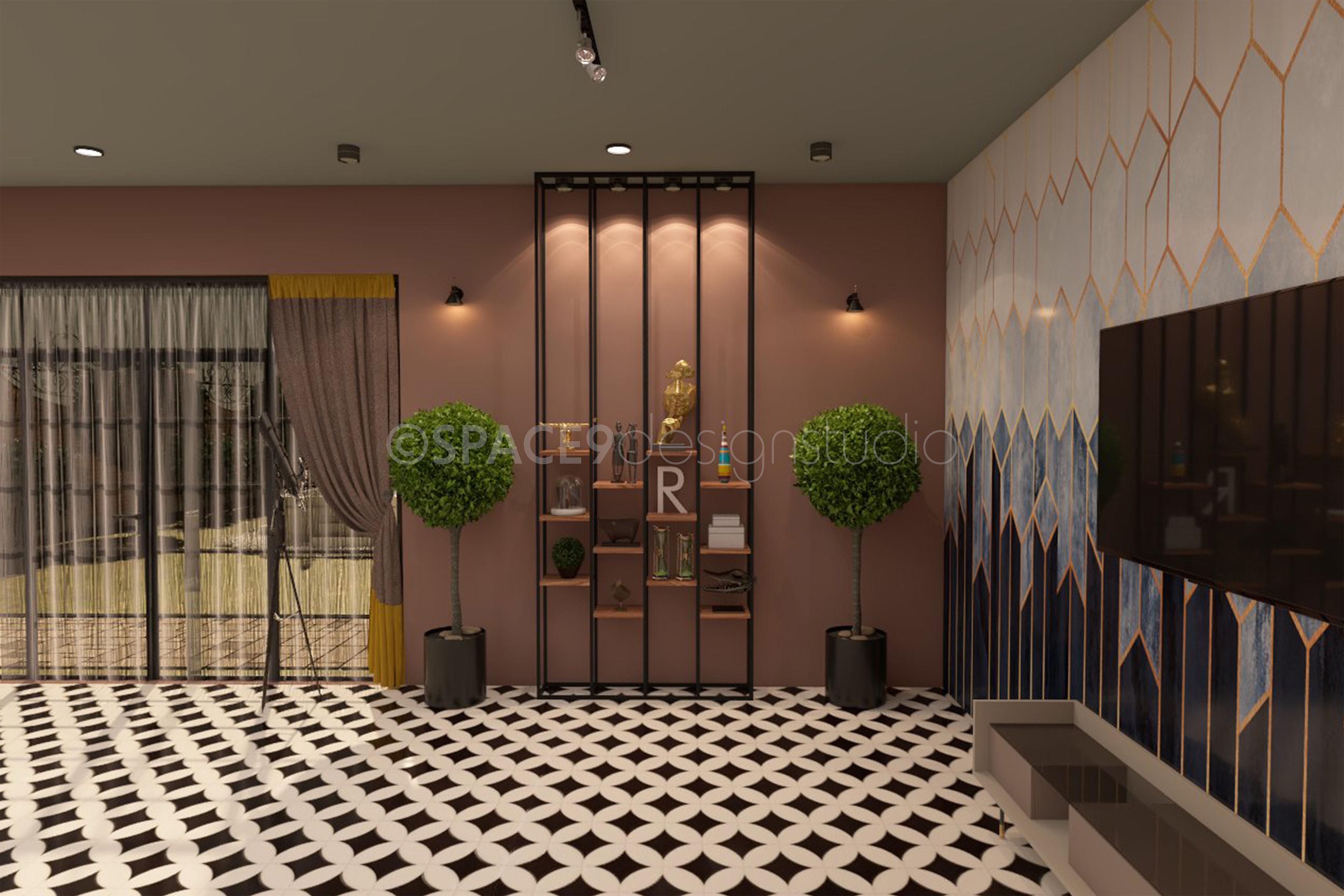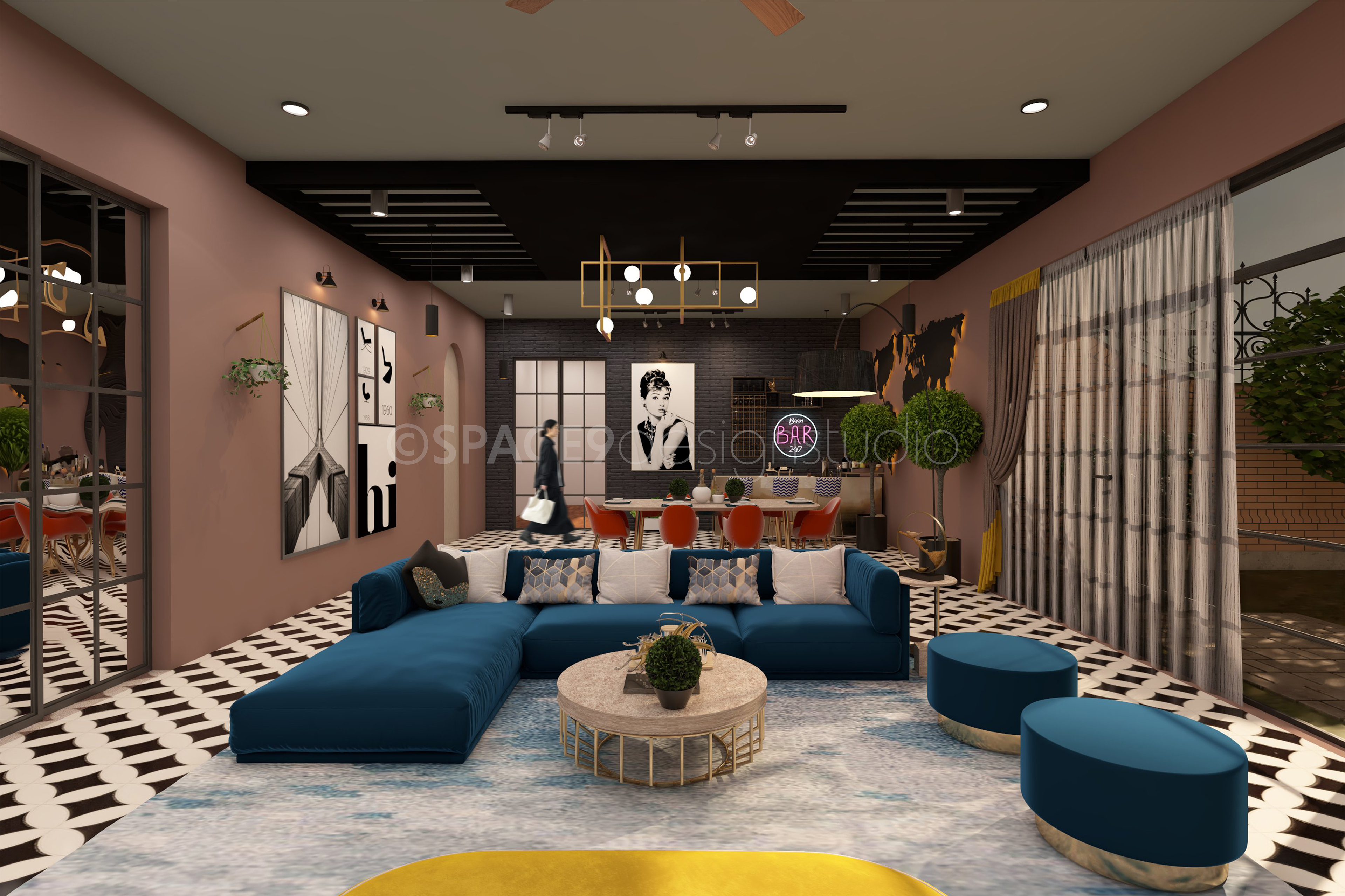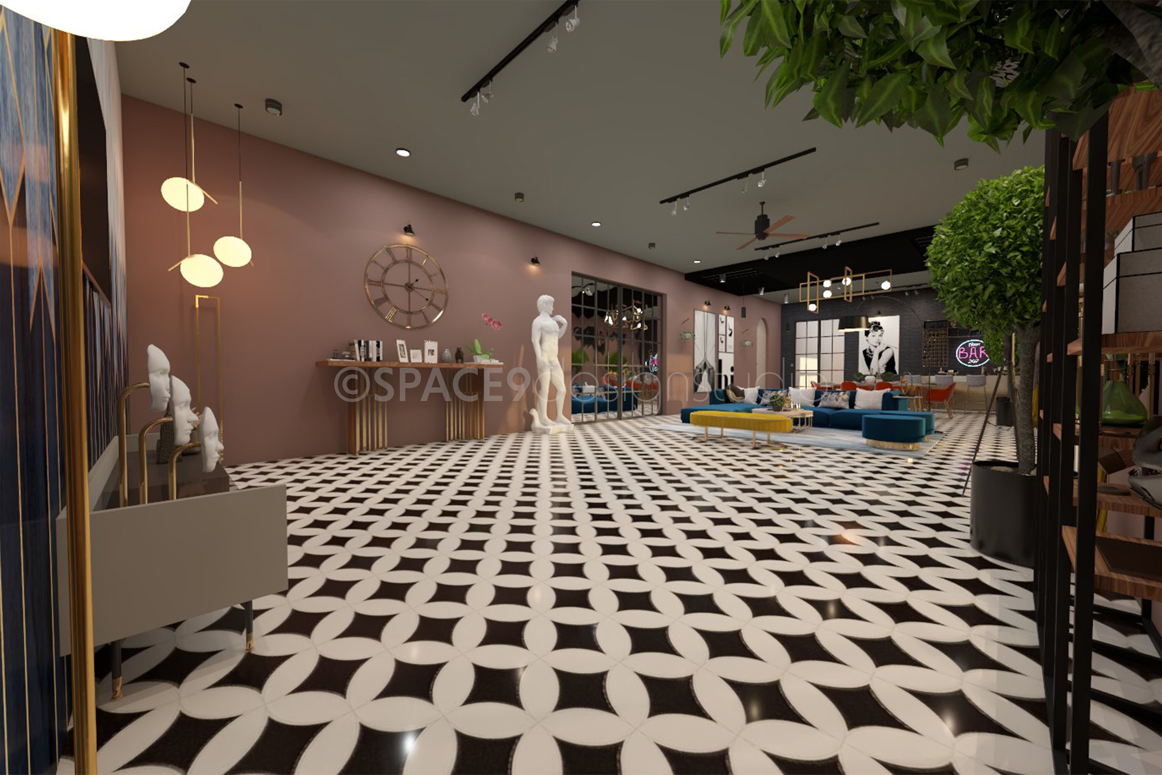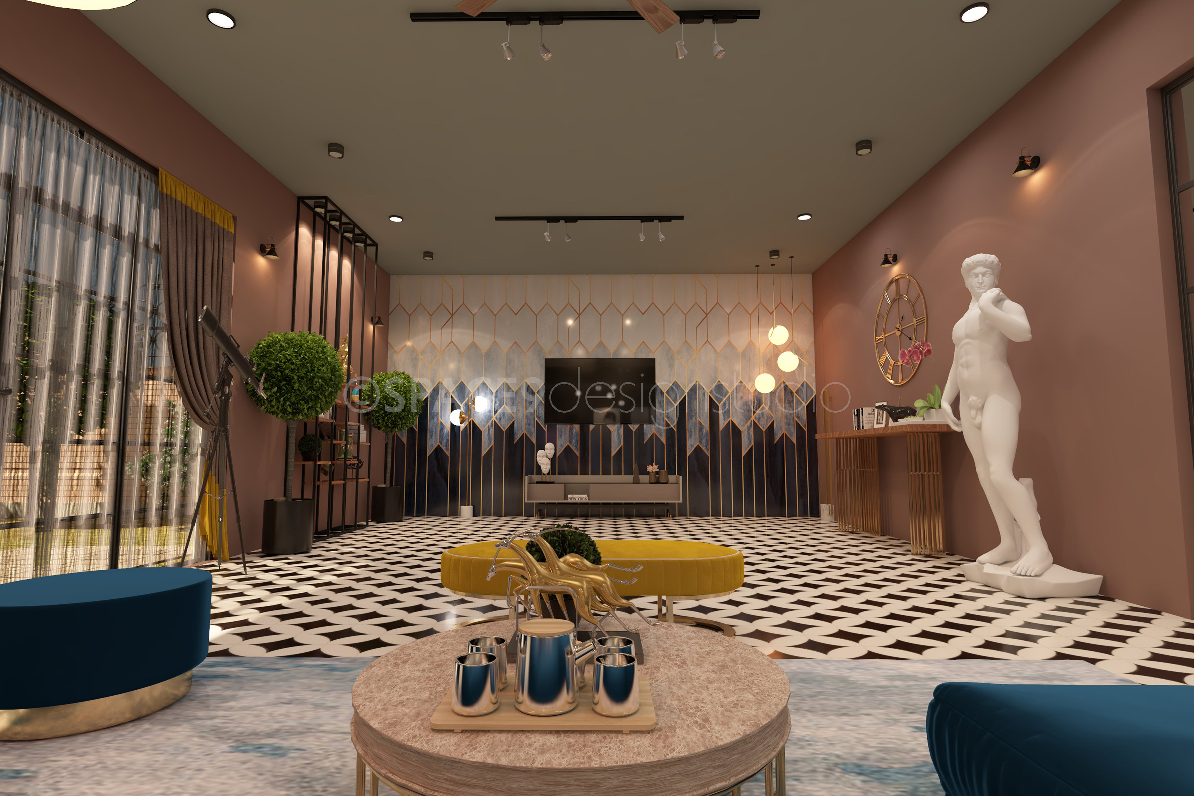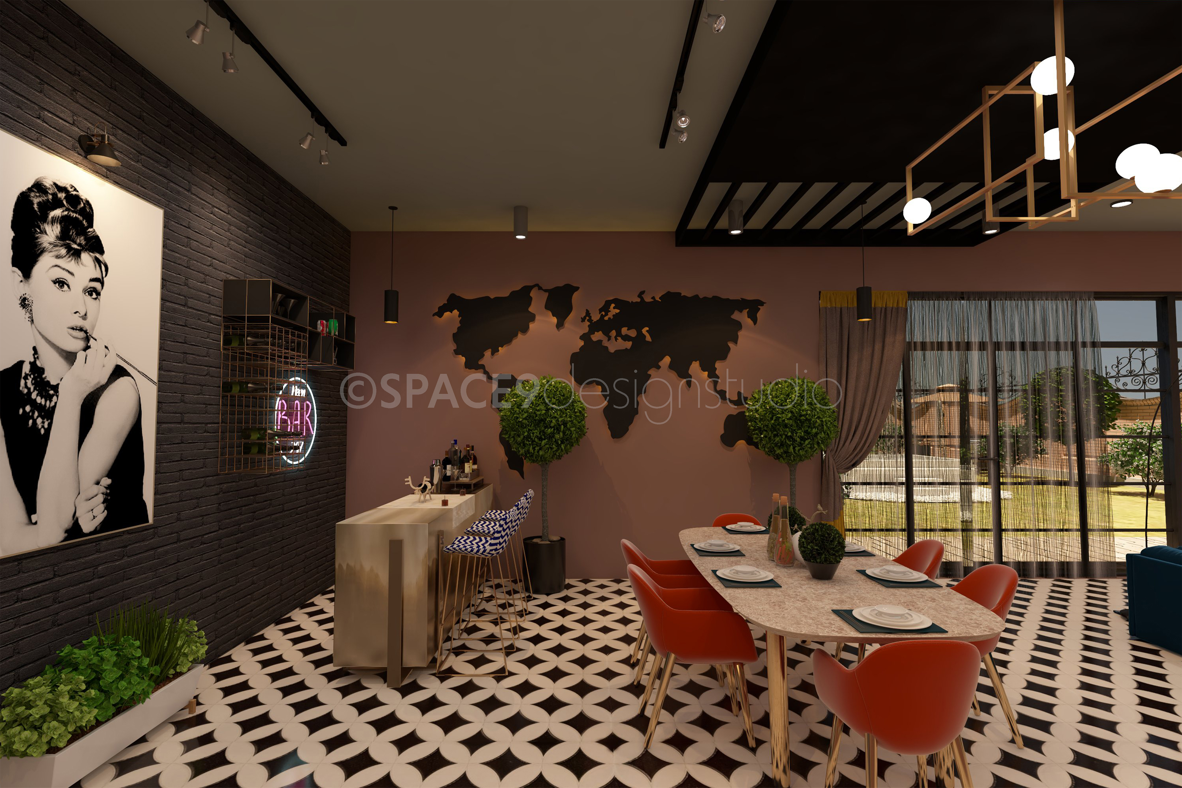 Art pieces, including monochrome portraits and abstract wall décor, add a contemporary edge, while statement lighting fixtures infuse glamour and drama. Large windows with sheer curtains allow natural light to filter in, balancing the richness of the palette with openness and airiness. From the bar nook with neon signage to the grand statue centerpiece, the villa reflects personality and playfulness. This design seamlessly merges modern luxury with artistic flair, making it an inspiring retreat.
